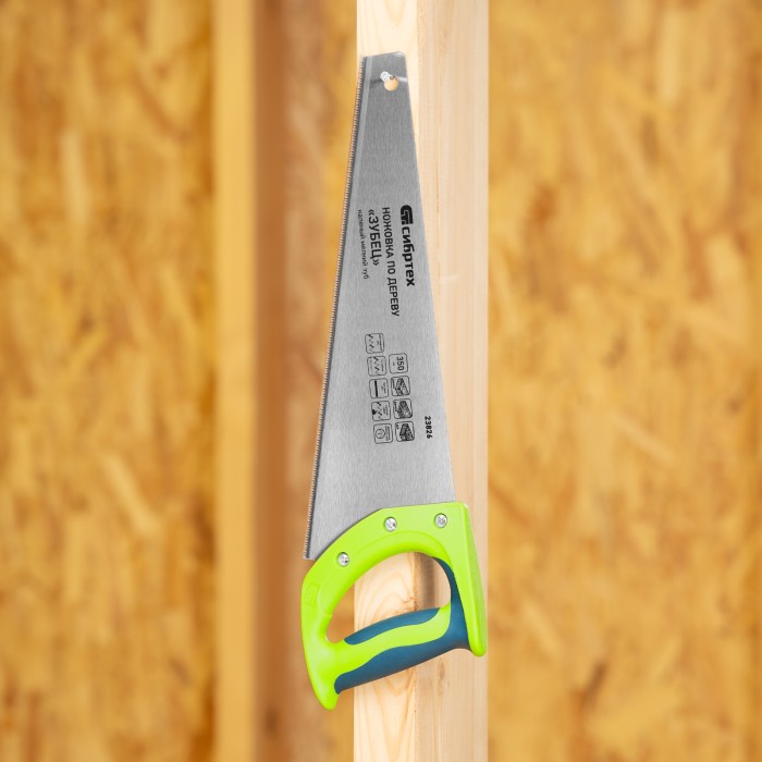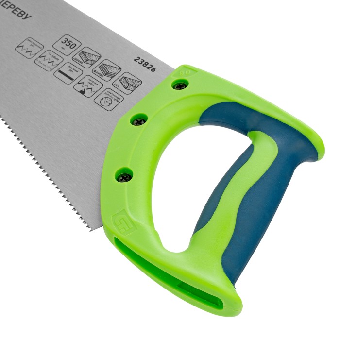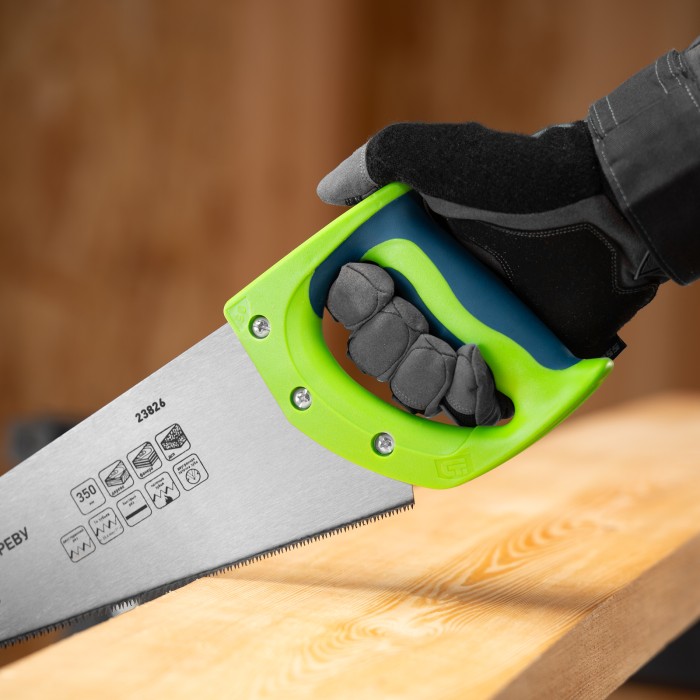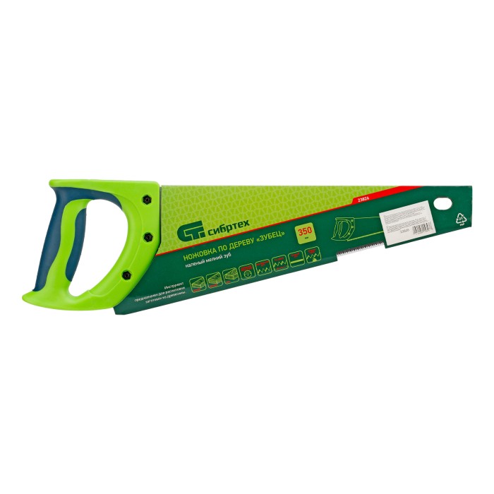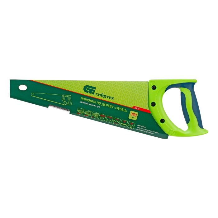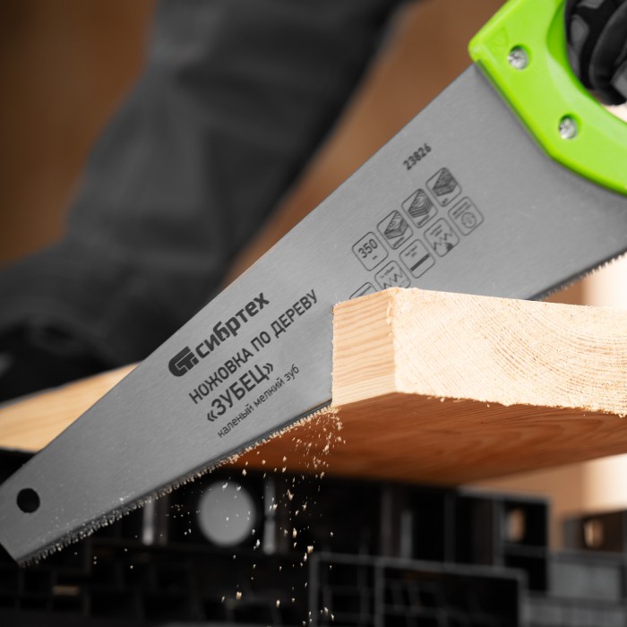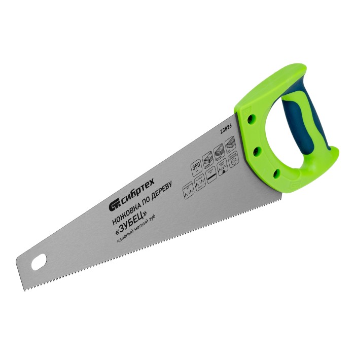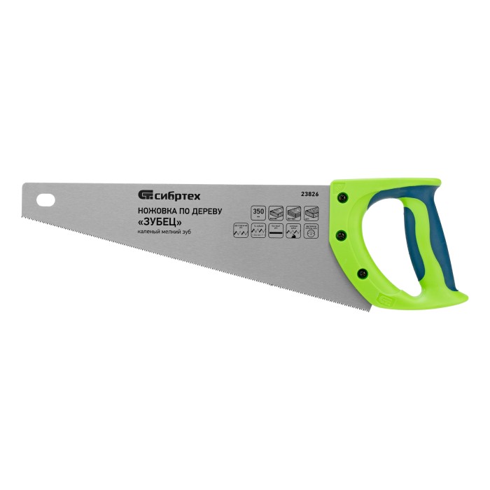 Ножовка по дереву Сибртех «Зубец» 23826 с полотном длиной 350 мм, калеными зубьями с 2D-заточкой и шагом 14 TPI, двухкомпонентной рукояткой, предназначена для точных пильных работ по древесине, фанере и ДСП. Подходит для двустороннего реза. Режущая часть с мелкими зубьями в количестве 14 на дюйм выполняет аккуратный и чистый распил. При необходимости кромку ножовки можно заточить. Инструмент будет полезен в столярной мастерской, а также пригодится в быту.ПреимуществаПрочность и долговечность — полотно изготовлено из пружинной стали 65Mn, обладающей упругостью и износостойкостью.Высокий ресурс работоспособности — зубья прошли закалку.Защита от коррозии — на полотно нанесено лаковое покрытие.Надежность — рукоятка изготовлена из ударопрочного пластика и зафиксирована на полотне при помощи 3 винтов.Комфорт во время работы — рукоятка обрезинена, поэтому не скользит в ладони и снижает нагрузку на кисть руки во время длительного пиления.