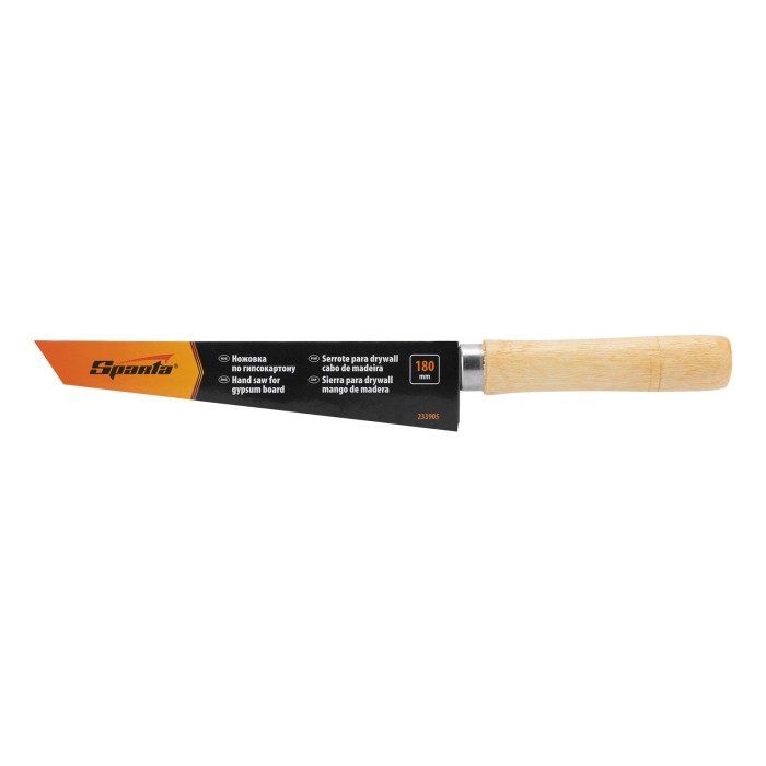 Ножовка по гипсокартону Sparta 233905 с полотном длиной 180 мм и деревянной рукояткой используется для выпиливания отверстий различной формы или сложных фигур из гипсокартона. Закаленные зубья с двухгранной заточкой легк...