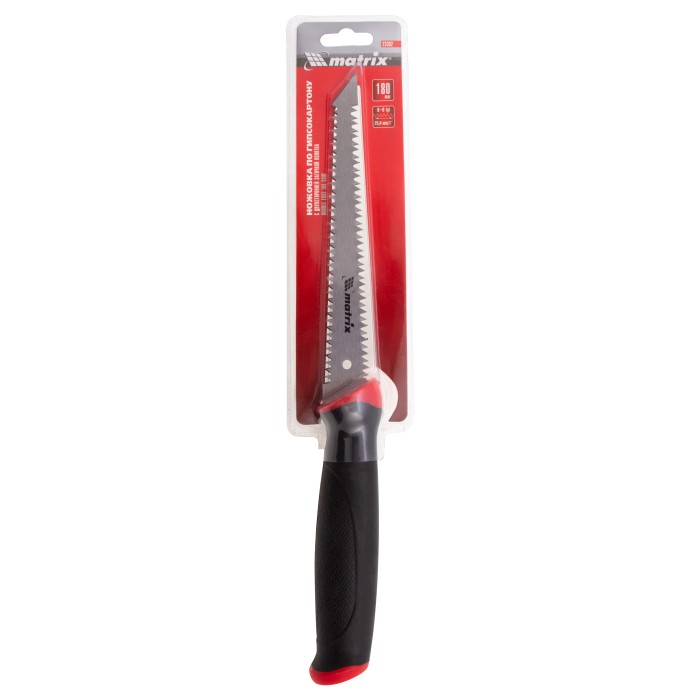 Ножовка Matrix 23392 с полотном длиной 180 мм и двухкомпонентной рукояткой, имеет полотно с двумя рабочими кромками, что облегчает вырезание отверстий и деталей различной формы при выполнении работ по гипсокартону. Зубья с шагом 9 TPI имеют двухгранную заточку, поэтому ножовкой можно пилить в любом направлении, что удобно в условиях ограниченного пространства. Инструмент будет полезен во время проведения ремонтных и отделочных работ.ПреимуществаПрочность и износостойкость — полотно изготовлено из пружинной стали 65Mn, зубья твердостью 50-55 HRC долго сохраняют режущую способность.Антикоррозийная защита — поверхность полотна покрыта лаком.Эргономичность — двухкомпонентная рукоятка с рельефной обрезиненной поверхностью не выскальзывает из ладони.Надежность — ножовка изготовлена на современном японском оборудовании и прошла контроль качества.