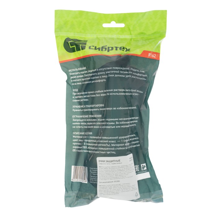 Защитные очки закрытого типа Сибртех 89162, герметичные, из поликарбоната, со всех сторон защищают глаза от попадания пыли, механического повреждения твердыми частицами, а также от разъедания газами, парами и жидкостями. Очки плотно прилегают к лицу благодаря обтюратору анатомической формы. Цельный корпус изготовлен из материала, не боящегося возгорания, что обеспечивает высокую степень защиты. Очки используются на производственных предприятиях, строительной площадке, в слесарной или столярной мастерской, а также будут полезны дома или в гараже.ПреимуществаДолговечность — линзы изготовлены из ударопрочного поликарбоната.Длительное ношение и отсутствие искажений — очкам присвоен оптический класс 1.Возможность использования людьми с нарушениями зрения — конструкция очков позволяет надевать их поверх корригирующих.Плотная фиксация на голове — защитные очки имеют удобную наголовную ленту с регулировкой по длине.Гипоаллергенность — очки изготовлены из высококачественных и безвредных материалов.Безопасность — характеристики изделия соответствуют требованиям ТР ТС 019/2011.