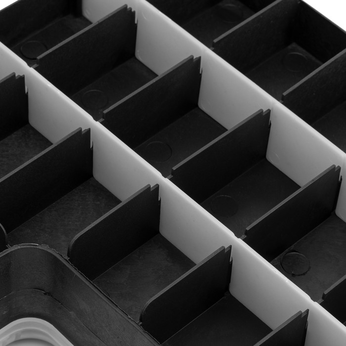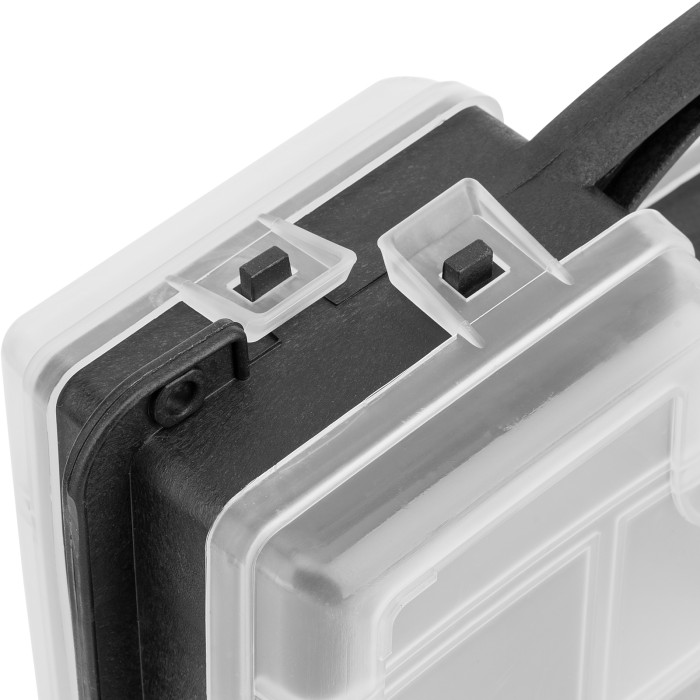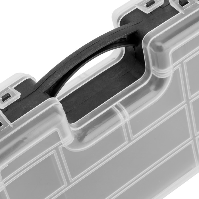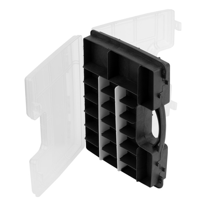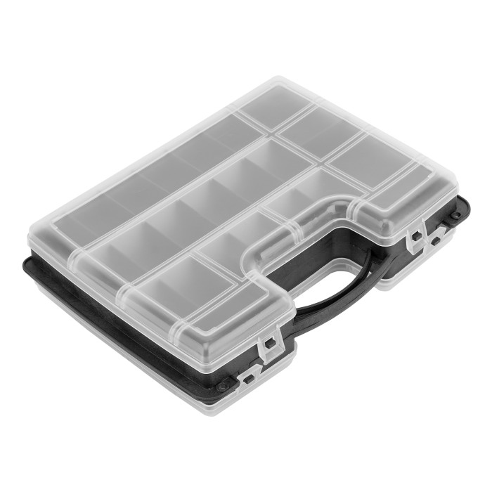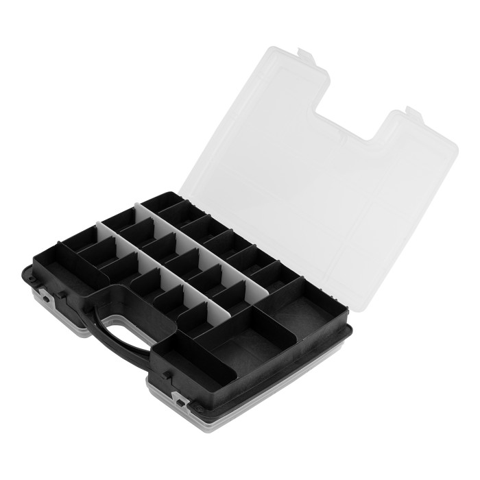 Двухсторонний органайзер Сибртех 90738 размером 295 х 220 х 76 мм помогает рассортировать мелкие вещи и хранить их в порядке и безопасности. В него можно положить снасти, крепеж, элементы рукоделия и т.д. Органайзер не занимает много места, поэтому его можно поместить под кровать, на стеллаж и в другие укромные места.ПреимуществаПолипропиленовый корпус отличается прочностью и износостойкостью, поэтому обеспечивает защиту вещей от пыли и влаги.Благодаря прозрачной крышке можно быстро просматривать содержимое органайзера.Органайзер оснащен 32 секциями различного размера для удобства хранения мелких и крупных предметов.За счет наличия ручки органайзер удобно транспортировать и брать на выездные работы.