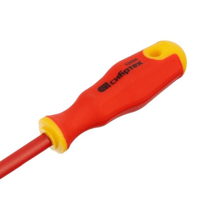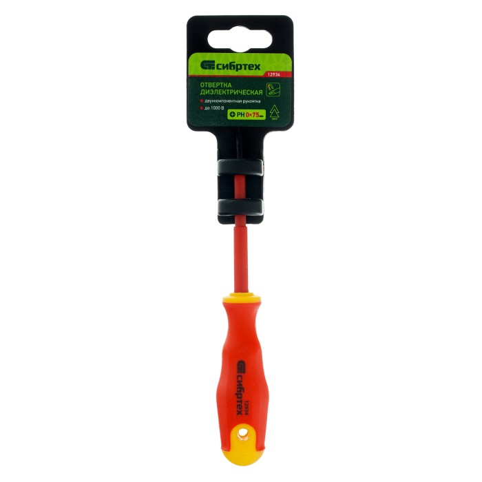 Диэлектрическая отвертка Сибртех 12934 до 1000 В, PH0 x 75 мм, из стали CrV, с двухкомпонентной рукояткой, предназначена для работы с крепежом типа Phillips «крест». Благодаря диэлектрическому покрытию она пригодится частным мастерам при замене розеток, подключении электросчетчиков и других работах. Стержня длиной 75 мм достаточно для демонтажа/монтажа крепежа в углублениях. Внимание — техника безопасности запрещает выполнять работы под напряжением!ПреимуществаСтержень отвертки изготовлен из высококачественной хромованадиевой стали и закален до необходимой твердости.Нанесенный на рукоятку калибр шлица позволяет легко найти нужную отвертку в наборе инструментов.За счет двухкомпонентной рельефной рукоятки с противоскользящим покрытием отверткой комфортно работать.Благодаря отверстию в рукоятке возможно подвесное хранение отвертки.