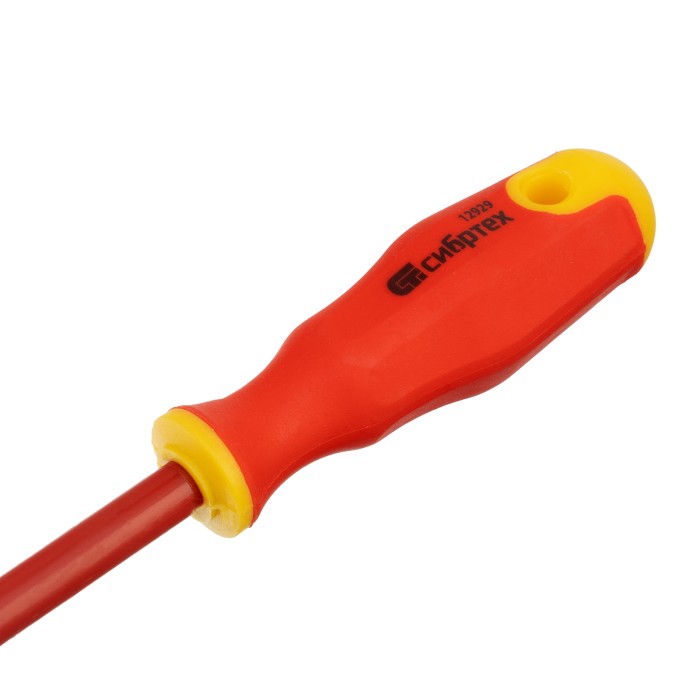 Диэлектрическая отвертка Сибртех 12929 до 1000 В, PH2 x 100 мм, из стали CrV, с двухкомпонентной рукояткой, предназначена для работы с крепежом типа Phillips «крест». Благодаря диэлектрическому покрытию она пригодится частным мастерам при замене розеток, подключении электросчетчиков и других работах. Стержня длиной 100 мм достаточно для демонтажа/монтажа крепежа в углублениях. Внимание — техника безопасности запрещает выполнять работы под напряжением!ПреимуществаСтержень отвертки изготовлен из высококачественной хромованадиевой стали и закален до необходимой твердости.Нанесенный на рукоятку калибр шлица позволяет легко найти нужную отвертку в наборе инструментов.За счет двухкомпонентной рельефной рукоятки с противоскользящим покрытием отверткой комфортно работать.Благодаря отверстию в рукоятке возможно подвесное хранение отвертки.