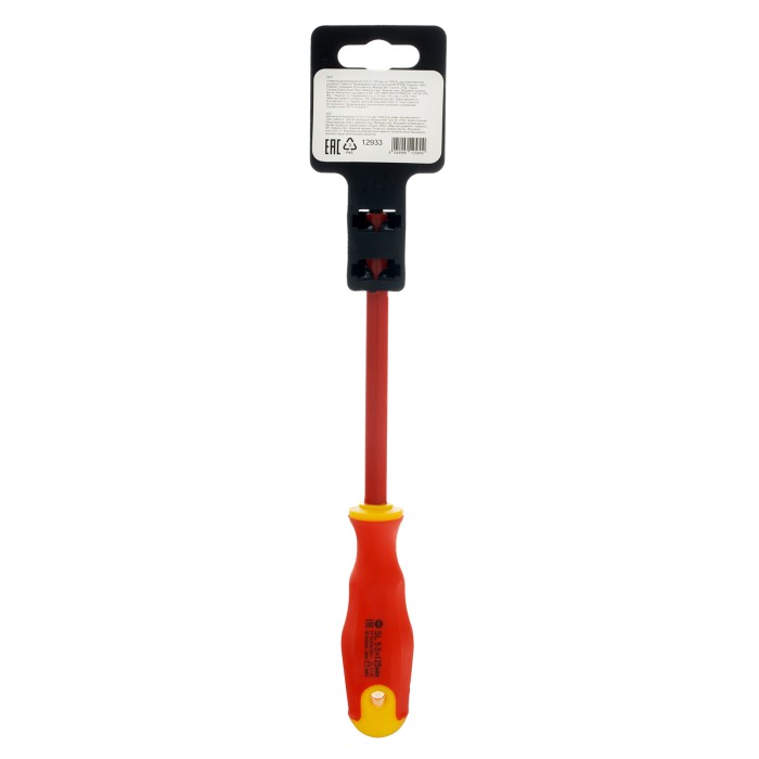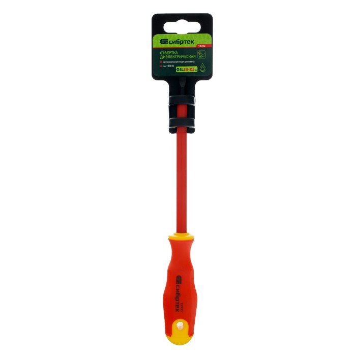 Диэлектрическая отвертка Сибртех 12933, SL5,5 х 125 мм, из стали CrV, с двухкомпонентной рукояткой, используется для монтажа/демонтажа крепежных элементов типа Slotted «минус». Отвертка рассчитана на полупрофессиональное применение: замену розеток, подключение электросчетчиков и т.д. Длина стержня 125 мм удобна для работы с крепежом на поверхности и в углублениях. Внимание — техника безопасности запрещает выполнять работы под напряжением!ПреимуществаСтержень из легированной закаленной хромованадиевой стали обеспечивает высокий ресурс и прочность отвертки.На рукоятку нанесен калибр шлица отвертки, таким образом легко найти нужный инструмент.Двухкомпонентная рукоятка рельефной формы повышает комфорт работы, т.к. не проскальзывает и удобно лежит в руке.В рукоятке имеется отверстие, благодаря чему отвертку можно подвешивать для компактного хранения.