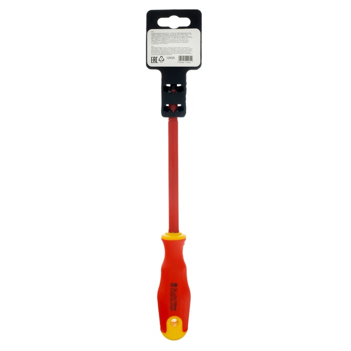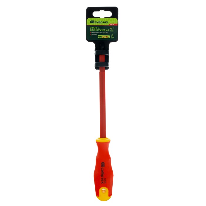 Диэлектрическая отвертка Сибртех 12935, SL6,5 х 150 мм, из стали CrV, с двухкомпонентной рукояткой, используется для монтажа/демонтажа крепежных элементов типа Slotted «минус». Отвертка рассчитана на полупрофессиональное применение: замену розеток, подключение электросчетчиков и т.д. Длина стержня 150 мм удобна для работы с крепежом на поверхности и в углублениях. Внимание — техника безопасности запрещает выполнять работы под напряжением!ПреимуществаСтержень из легированной закаленной хромованадиевой стали обеспечивает высокий ресурс и прочность отвертки.На рукоятку нанесен калибр шлица отвертки, таким образом легко найти нужный инструмент.Двухкомпонентная рукоятка рельефной формы повышает комфорт работы, т.к. не проскальзывает и удобно лежит в руке.В рукоятке имеется отверстие, благодаря чему отвертку можно подвешивать для компактного хранения.