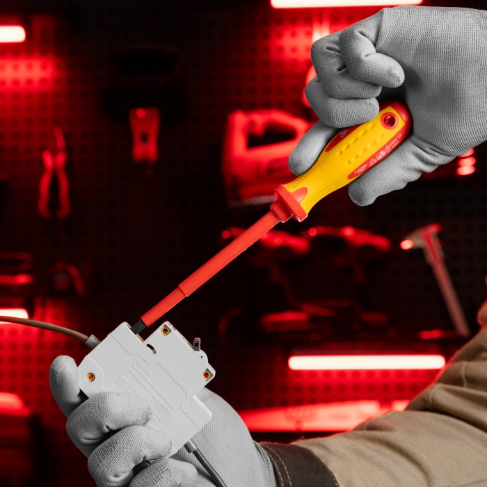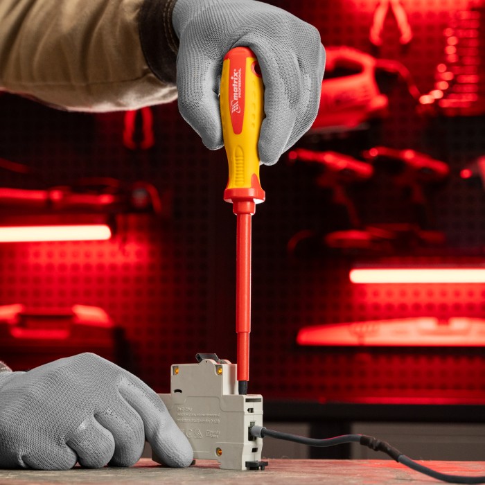 Отвертка Matrix Insulated 12918, SL5,5 x 125 мм, из стали CrMo, с двухкомпонентной рукояткой до 1000 В, используется при проведении ремонтных с крепежом типа Slotted «минус». Благодаря диэлектрическому покрытию она выдерживает напряжение до 1000 В, поэтому оптимально подходит для настройки электрооборудования, установки розеток и др. Важно — техника безопасности запрещает работать под напряжением!ПреимуществаИзносостойкость и прочность — стержень выполнен из хромомолибденовой стали твердостью 50-56 HRC.Надежность — отвертка имеет немецкий сертификат VDE, подтверждающий диэлектрические свойства до 1000 В.Намагниченный наконечник — крепеж фиксируется на стержне отвертки и не выпадает.Удобство работы — на рукоятку нанесена информация с калибром шлица.Комфортная работа — двухкомпонентная эргономичная рукоятка с рельефными подпальцевыми выемками удобно лежит в руке и не проскальзывает.Удобное хранение — на рукоятке отвертки есть отверстие для подвеса.