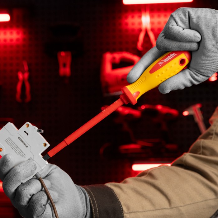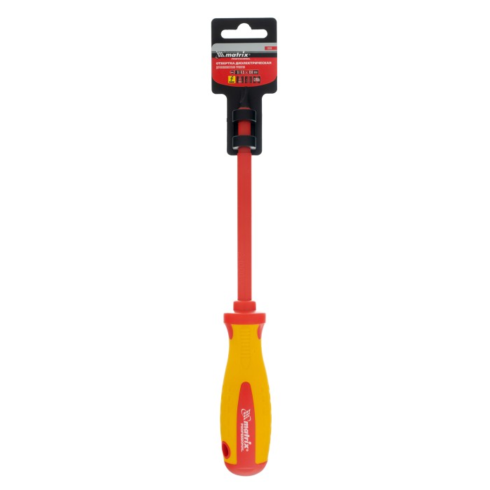 Отвертка Matrix Insulated 12920, SL6,5 x 150 мм, из стали CrMo, с двухкомпонентной рукояткой до 1000 В, используется при проведении ремонтных с крепежом типа Slotted «минус». Благодаря диэлектрическому покрытию она выдерживает напряжение до 1000 В, поэтому оптимально подходит для настройки электрооборудования, установки розеток и др. Важно — техника безопасности запрещает работать под напряжением!ПреимуществаИзносостойкость и прочность — стержень выполнен из хромомолибденовой стали твердостью 50-56 HRC.Надежность — отвертка имеет немецкий сертификат VDE, подтверждающий диэлектрические свойства до 1000 В.Намагниченный наконечник — крепеж фиксируется на стержне отвертки и не выпадает.Удобство работы — на рукоятку нанесена информация с калибром шлица.Комфортная работа — двухкомпонентная эргономичная рукоятка с рельефными подпальцевыми выемками удобно лежит в руке и не проскальзывает.Удобное хранение — на рукоятке отвертки есть отверстие для подвеса.