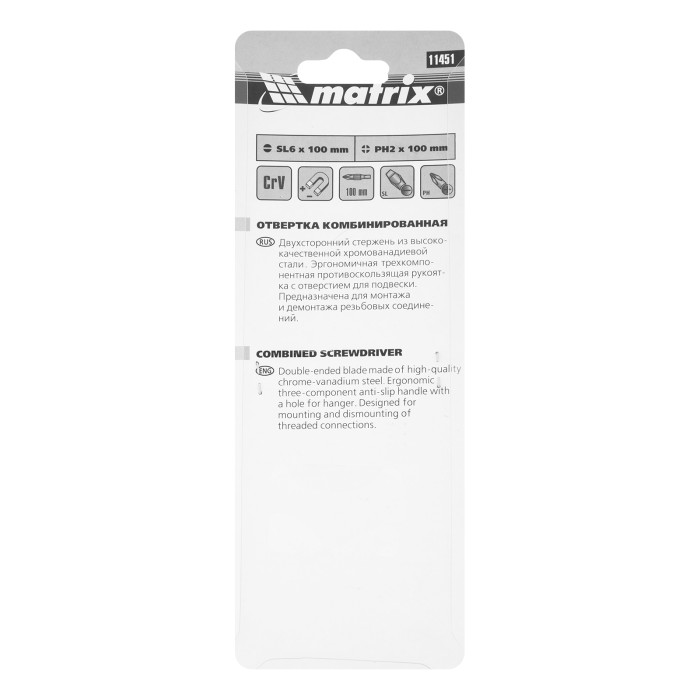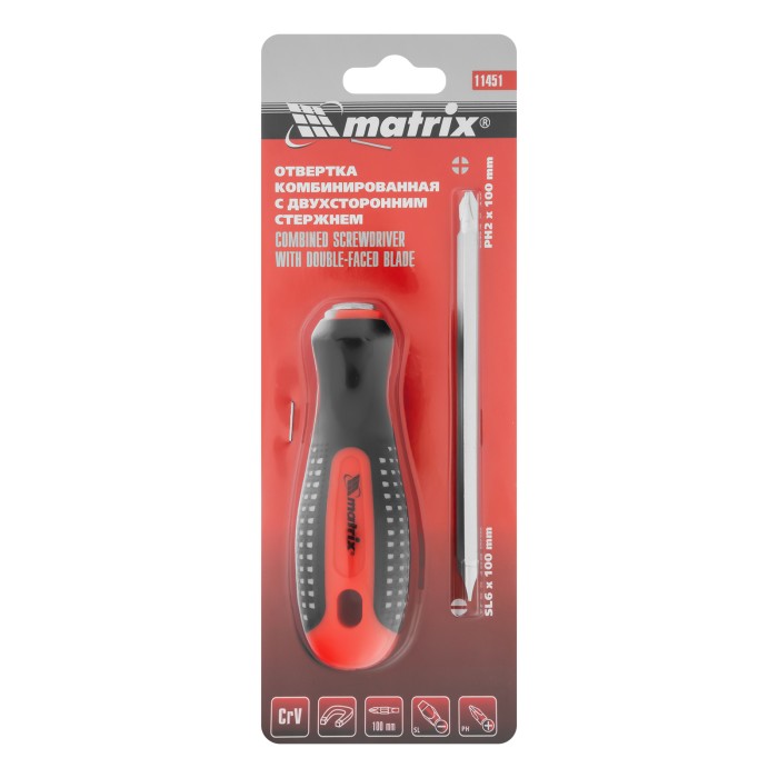 Комбинированная отвертка Matrix Fusion 11451, SL6,0 / PH2 мм, CrV, с 3-х компонентной рукояткой «anti slip», будет полезна профессиональным мастерам при проведении строительных и монтажных работ. Благодаря двустороннему стержню она позволяет проводить монтаж/демонтаж крепежа со шлицами Phillips и Slotted. Отвертка со стержнем 125 мм позволяет работать с крепежом в углублениях.ПреимуществаСтержень и жало выполнены из износостойкой легированной стали CrV твердостью 50-52 HRC, что обеспечивает долгий срок службы отвертки.Намагниченный наконечник позволяет зафиксировать крепеж и направлять отвертку одной рукой, а другой придерживать закрепляемую деталь.Трехкомпонентная рукоятка «anti slip» с подпальцевыми выемками и специальными секциями обеспечивает комфортный и надежный хват без проскальзывания.