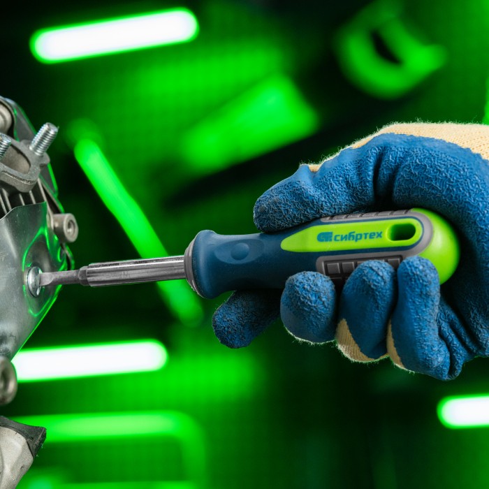 Комбинированная отвертка Сибртех 13377 с двухсторонними битами позволяет закручивать и извлекать крепежные элементы со шлицами SL5,0 / PH1, SL6,0 / PH2. Будет полезна при проведении мелких ремонтных и монтажных работ в доме, на даче, в гараже. Стержень длиной 75 мм удобен для работы с легкодоступным крепежом и в углублениях.ПреимуществаДолговечность и устойчивость к нагрузкам — стержень и биты изготовлены из высококачественной стали CrV, биты закалены до твердости 50-52 HRC.Защита от коррозии — на стержень нанесено хромовое покрытие, на биты — фосфатное.Прочная фиксация — благодаря металлическим шариковым фиксаторам стержень надежно соединяется с рукояткой, а биты — со стержнем.Комфортная эксплуатация — рабочие части намагничены, эргономичная рукоятка позволяет долго работать без ощущения усталости.