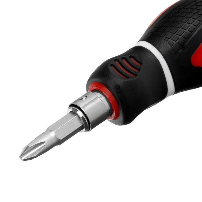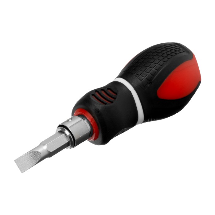 Комбинированная отвертка Matrix 11581 из стали CrV, с двухкомпонентной рукояткой и стержнем длиной 38 мм, позволяет монтировать и демонтировать крепеж типоразмера SL6,0 и PH2. Она рассчитана на профессиональное использование, в частности, осуществление строительных и монтажных работ. Благодаря длине стержня 38 мм и укороченной рукоятке можно производить работы в ограниченном пространстве.ПреимуществаДвухсторонний стержень выполнен из легированной хромованадиевой стали, рабочая часть закалена до твердости 50-55 HRC, поэтому отвертка выдерживает высокие нагрузки.Встроенный зажимной механизм присоединительного шестигранника обеспечивает надежную фиксацию стержня.Наконечник намагничен, что позволяет освободить одну руку и придерживать ею закрепляемую деталь.Двухкомпонентная укороченная рукоятка с подпальцевыми выемками обеспечивает удобство работы и не проскальзывает в руке.