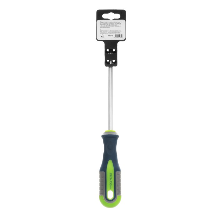Отвертка Сибртех 11813, PH3 х 150 мм, из стали CrV, с 3-х компонентной рукояткой, пригодится частным мастерам для монтажа/демонтажа крепежных элементов типоразмера PH3. Она поможет произвести ремонтные и монтажные работы дома, в гараже, на даче. Благодаря стержню длиной 150 мм отверткой можно работать в углублениях.ПреимуществаСтержень отвертки обладает высокой прочностью и износостойкостью, т.к. изготовлен из хромованадиевой стали и закален до твердости 50-54 HRC.Фосфатированная рабочая часть позволяет добиться лучшего сцепления с головкой крепежа.За счет обозначения типа шлица и длины стержня на рукоятке удобно находить нужную отвертку.Трехкомпонентная рукоятка оснащена квадратными насечками и подпальцевыми выемками, за счет чего удобно ложится в руку и снижает нагрузку на запястье.