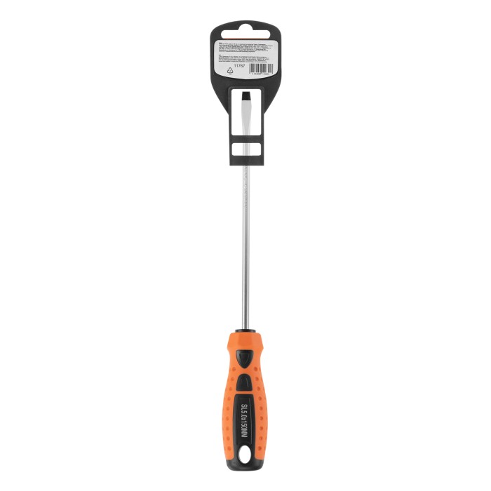 Отвертка Sparta «Point» 11767 из стали CrV, с 2-х компонентной рукояткой, рассчитана на бытовое применение для работ с крепежом типоразмера SL5,0. Она пригодится мастерам при осуществлении мелких ремонтных работ. Стержень длиной 150 мм позволяет закручивать и извлекать крепеж как с поверхностей, так и из углублений.ПреимуществаИзносостойкость и долговечность — стержень выполнен из углеродистой стали.Улучшенное сцепление с крепежом — рабочая часть фосфатирована.Удобство работы — на рукоятке имеется маркировка с типом шлица и длины стержня отвертки.Двухкомпонентная эргономичная рукоятка — увеличенная передача крутящего момента позволяет добиться снижения нагрузки на запястье.