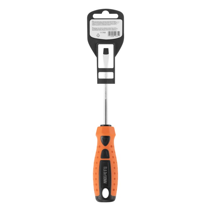 Отвертка Sparta «Point» 11768 из стали CrV, с 2-х компонентной рукояткой, рассчитана на бытовое применение для работ с крепежом типоразмера SL6,0. Она пригодится мастерам при осуществлении мелких ремонтных работ. Стержень длиной 100 мм позволяет закручивать и извлекать крепеж как с поверхностей, так и из углублений.ПреимуществаИзносостойкость и долговечность — стержень выполнен из углеродистой стали.Улучшенное сцепление с крепежом — рабочая часть фосфатирована.Удобство работы — на рукоятке имеется маркировка с типом шлица и длины стержня отвертки.Двухкомпонентная эргономичная рукоятка — увеличенная передача крутящего момента позволяет добиться снижения нагрузки на запястье.