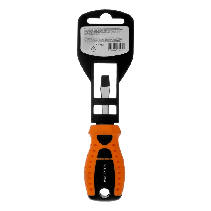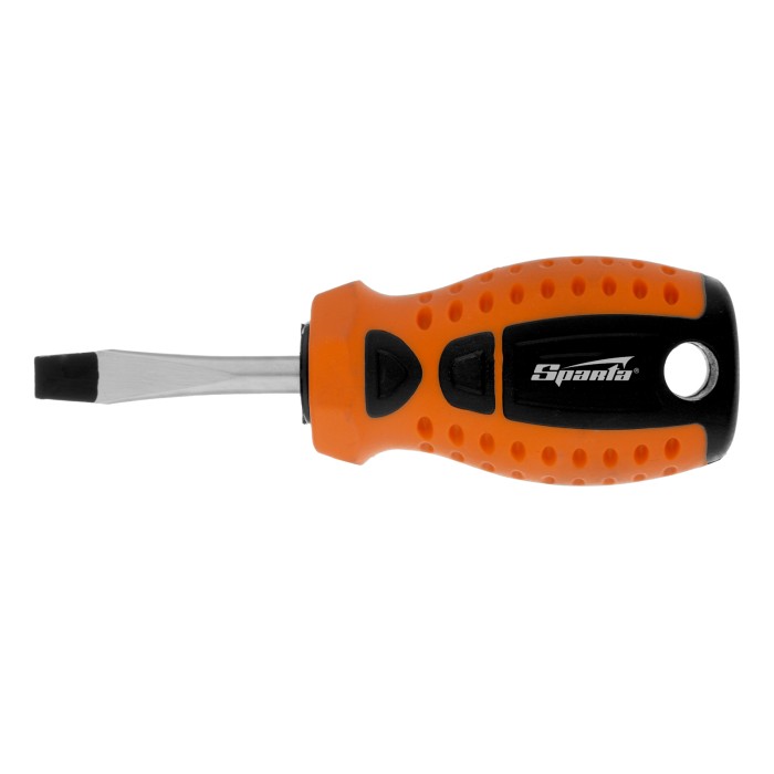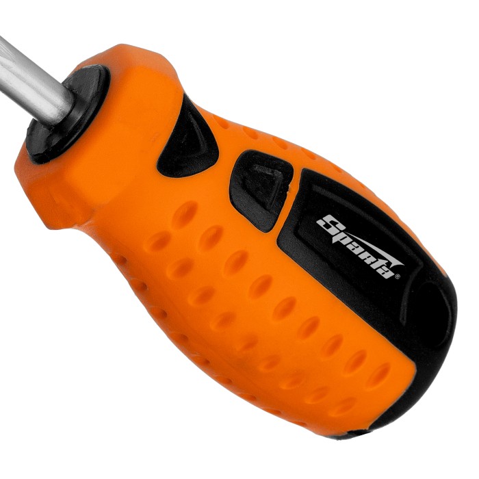 Отвертка Sparta «Point» 11751 из стали CrV, с 2-х компонентной рукояткой, рассчитана на бытовое применение для работ с крепежом типоразмера SL6. Она пригодится мастерам при осуществлении мелких ремонтных работ. Укороченный стержень длиной 38 мм повышает удобство работы в труднодоступных местах, что особенно актуально в автомастерской.ПреимуществаИзносостойкость и долговечность — стержень выполнен из углеродистой стали.Улучшенное сцепление с крепежом — рабочая часть фосфатирована.Удобство работы — на рукоятке имеется маркировка с типом шлица и длины стержня отвертки.Двухкомпонентная эргономичная рукоятка — увеличенная передача крутящего момента позволяет добиться снижения нагрузки на запястье.
