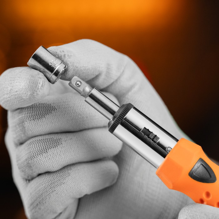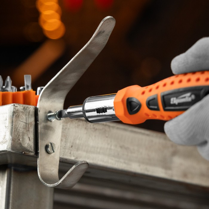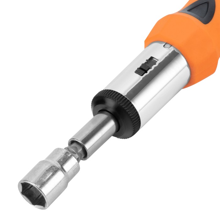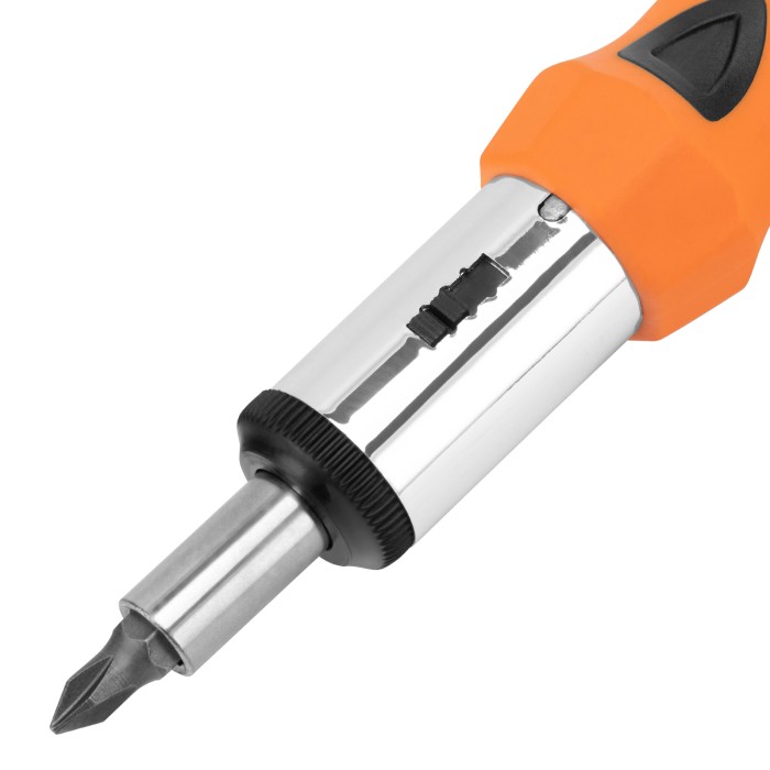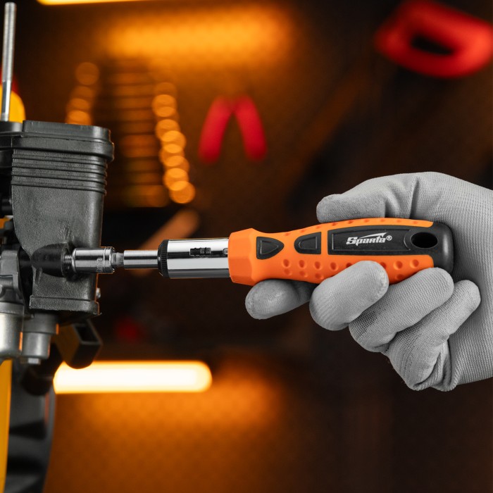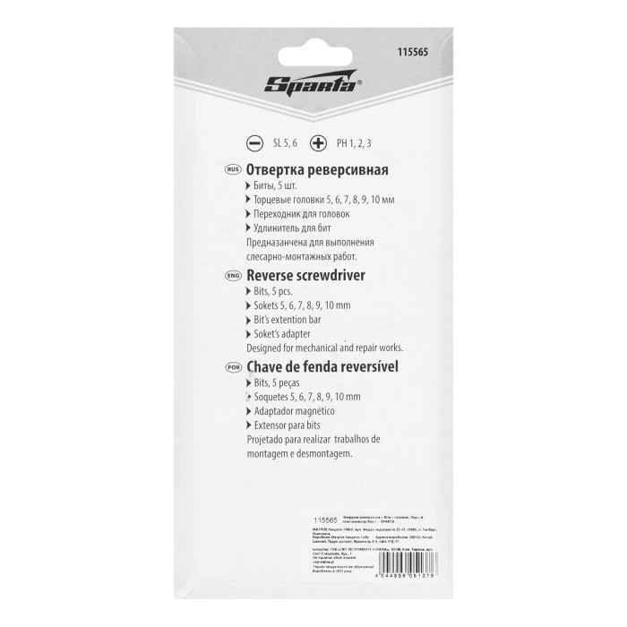 Реверсивная отвертка с шарниром Sparta 115565 входит в набор из 14 предметов, включающий также биты с хвостовиком 1/4 дюйма (тип С), торцевые головки и переходник для торцевых головок. Инструмент с насадками применяется ...