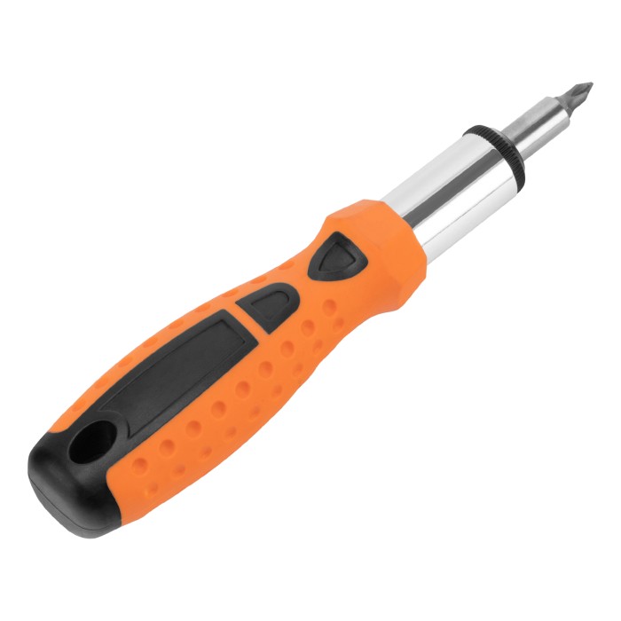 Реверсивная отвертка с шарниром Sparta 115565 входит в набор из 14 предметов, включающий также биты с хвостовиком 1/4 дюйма (тип С), торцевые головки и переходник для торцевых головок. Инструмент с насадками применяется для быстрого и эффективного монтажа/демонтажа резьбовых соединений. Реверсивный механизм значительно облегчает работу и снижает усталость рук, т.к. не требуется постоянно перехватывать ручку отвертки. С отверткой можно использовать любые биты длиной 25 мм. Комплект пригодится частным мастерам при проведении ремонтных работ. ПреимуществаБиты и торцевые головки из углеродистой стали характеризуются высокой прочностью и износостойкостью.Реверс позволяет менять направление вращения стержня для откручивания крепежа.Двухкомпонентная рукоятка повышает удобство работы, т.к. не проскальзывает в руке.