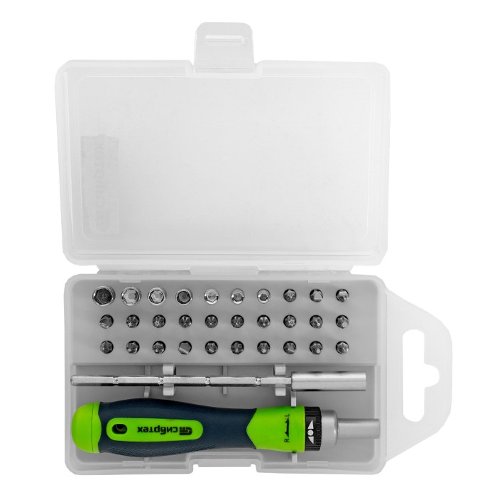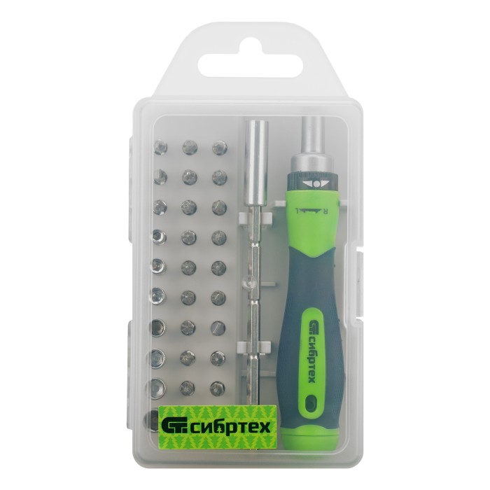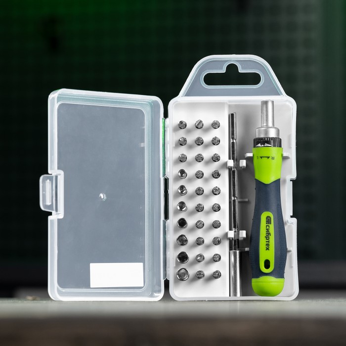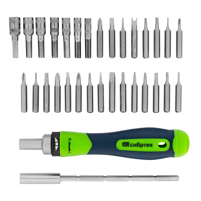 Отвертка реверсивная для точных работ с набором бит и торцевых головок, 32 предмета, CrV Сибртех
