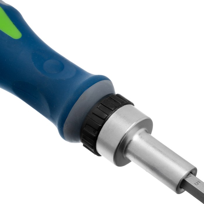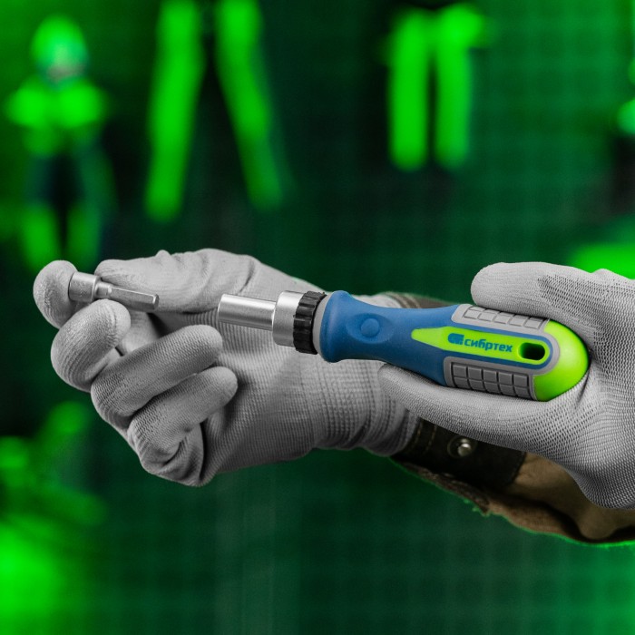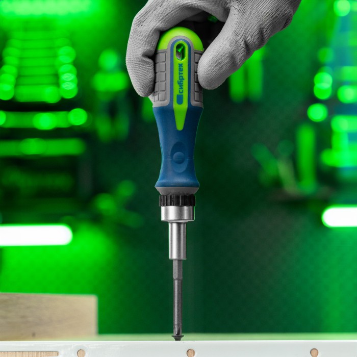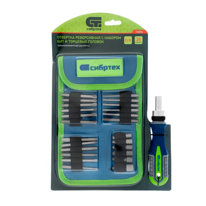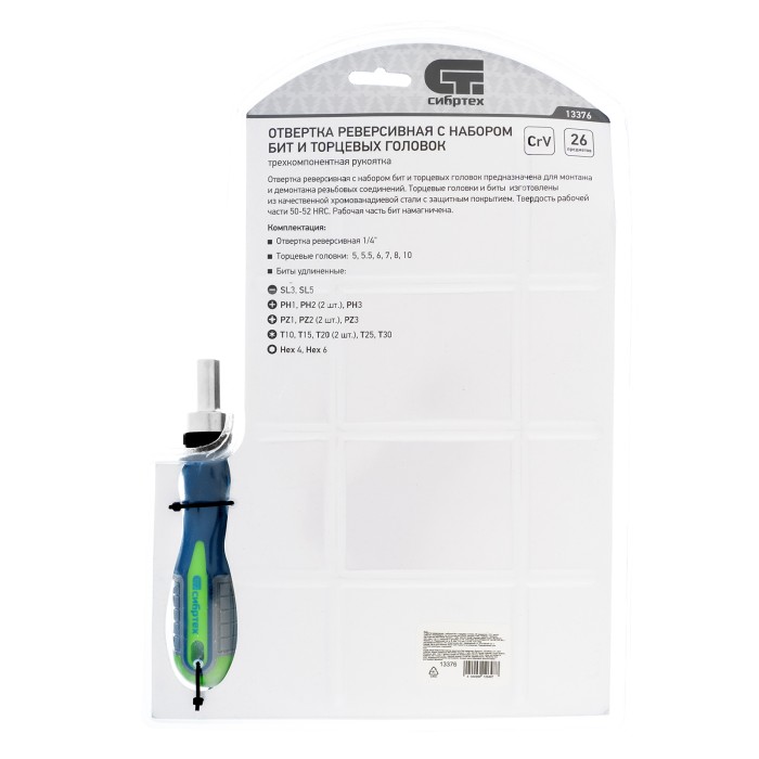 Реверсивная отвертка с набором бит и торцевых головок Сибртех 13376, 25 предметов из стали CrV в чехле, — это надежный инструмент для решения бытовых задач. С помощью сменных бит можно производить монтаж/демонтаж резьбовых соединений со шлицами SL, PH, PZ, TORX, HEX. А благодаря их удлиненной конструкции обеспечивается доступ к труднодоступным местам. Торцевые головки позволяют работать с болтами, гайками и другим крепежом.ПреимуществаВысококачественное исполнение — насадки выполнены из прочной и долговечной хромованадиевой стали с защитным покрытием.Высокая твердость — рабочие части закалены до 50-52 HRC, поэтому насадки выдерживают нагрузки. Наличие реверса — в процессе эксплуатации не нужно постоянно переставлять руку, что значительно повышает удобство работы.Универсальность — набор укомплектован битами наиболее распространенных размеров: SL3, SL5, PH1-3, PZ1-3, T10, Т15, Т20, Т25, Т30, Н4, H6.Надежный хват и комфортная работа — рукоятки имеют антискользящие резиновые насечки.Удобство хранения и транспортировки — комплект размещен в мягком тканевом чехле.