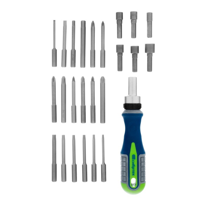 Отвертка реверсивная с набором бит и торцевых головок, 25 шт, CrV, чехол Сибртех