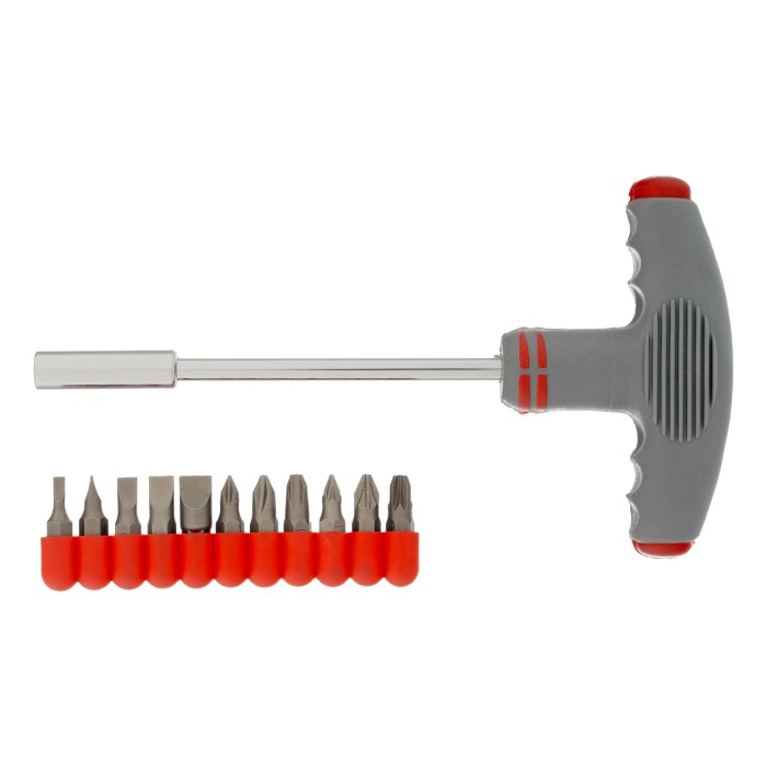 Отвертка с Т-образной эргономичной ручкой и набором бит, 11 шт, CrV Matrix
