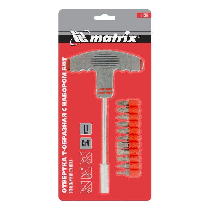 Отвертка Matrix 11567 с Т-образной эргономичной ручкой и набором бит из 11 шт., из стали CrV, — это держатель с присоединительным шестигранником, в котором фиксируется бита необходимого типоразмера. Отвертка служит для з...