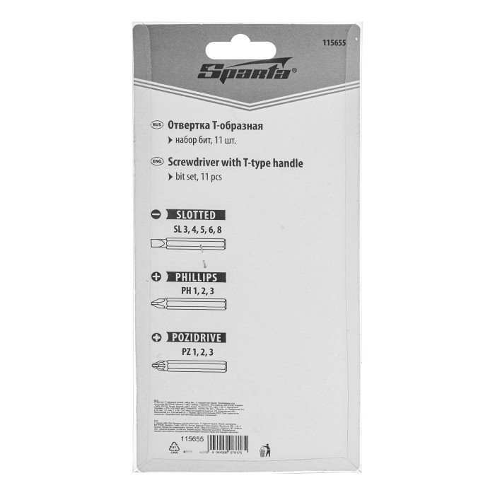 Отвертка Sparta 115655 с Т-образной ручкой, с набором бит из 11 предметов, используется для закручивания и откручивания винтов, саморезов и других крепежных элементов. В комплект поставки входят биты самых распространенных размеров со шлицами PH, PZ и SL. Т-образная рукоятка увеличивает силу крутящего момента, экономя силы мастера. Набор предназначен для ремонта техники, сборки мебели и рекомендован для применения в домашних условиях.ПреимуществаВысокая прочность — биты из углеродистой стали 45 устойчивы к механическим нагрузкам.Универсальность — отвертка совместима с битами любых производителей, поэтому ее можно доукомплектовать необходимыми насадками.Быстрый поиск нужной насадки — благодаря гибкой плашке-держателю биты не потеряются.Удобное хранение — в рукоятке имеется отверстие для подвешивания отвертки.