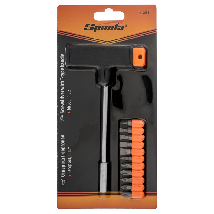 Отвертка Sparta 115655 с Т-образной ручкой, с набором бит из 11 предметов, используется для закручивания и откручивания винтов, саморезов и других крепежных элементов. В комплект поставки входят биты самых распространенн...