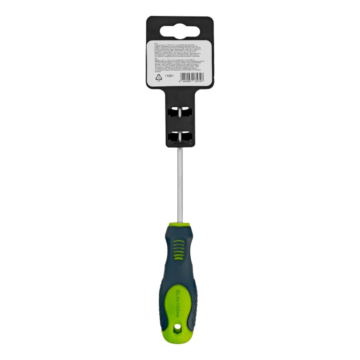 Отвертка Сибртех 11861, SL4,0 х 100 мм, из стали CrV, с 2-х компонентной рукояткой, подходит для работ, не требующих большого усилия затяжки. С ее помощью осуществляется монтаж/демонтаж крепежных элементов типа Slotted. Отвертка оснащена стержнем длиной 100 мм для работ в углублениях и на поверхностях. Инструмент пригодится для полупрофессионального применения.ПреимуществаСтержень из хромованадиевой стали твердостью 50-54 HRC характеризуется износостойкостью, что положительно сказывается на его сроке службы.Фосфатированный наконечник стержня позволяет добиться улучшенного сцепления с головкой крепежа.Отвертка имеет маркировку с типом шлица и длины стержня для удобства поиска отвертки среди других инструментов.Специальные насечки на двухкомпонентной эргономичной рукоятке предотвращают ее проскальзывание в руке.