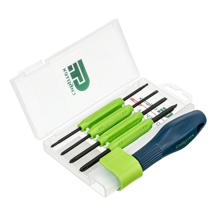 Отвертка со сменными двухсторонними насадками Сибртех 13386, 8 в 1, из стали CrV, в пластиковом кейсе, рассчитана на работу с мелкими деталями. С ее помощью можно осуществить точные работы при ремонте электроники, часов, очков и различных приборов. Набор предназначен для бытового применения.ПреимуществаСтержни выполнены из хромованадиевой стали и закалены до твердости 50-56 HRC, что обеспечивает прочность и устойчивость инструментов к нагрузкам.На рукоятке имеются ребра для лучшего удержания отвертки.Компактное и удобное хранение набора обеспечивает карманный пластиковый кейс с защелкой.