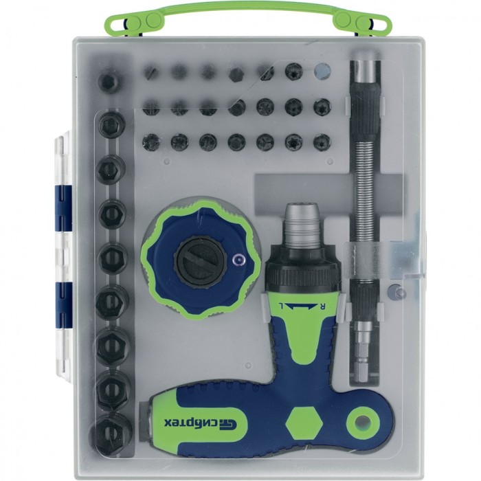 Отвертка Т-образная и трещотка, реверсивные с набором бит, торцевых головок, 34 предмета, CrV Сибртех