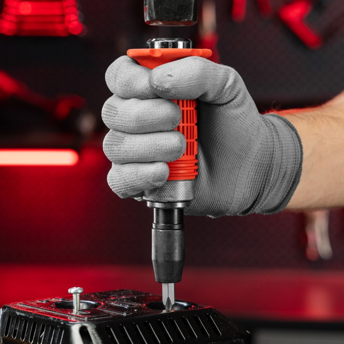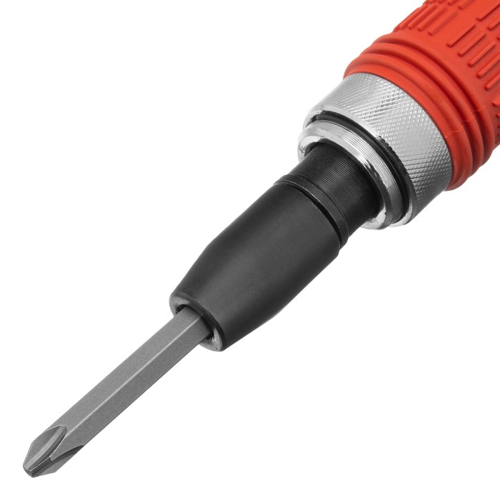 Ударно-поворотная отвертка Matrix 11579 с присоединительным размером 1/2 дюйма, с набором бит из 6 шт., с обрезиненной ручкой, в пластиковом боксе, используется для работ с резьбовыми соединениями. Благодаря металлическому затыльнику выдерживает удары молотком, поэтому справляется даже с перетянутыми или заржавевшими крепежами. Входящие в набор биты подходят для шлицев SL и PH. Инструмент предназначен для бытового использования, а также будет полезен дома, на даче или в гараже.ПреимуществаОтвертка из углеродистой стали устойчива к регулярным механическим нагрузкам и рассчитана на длительную эксплуатацию.Присоединительный квадрат 1/2 дюйма с шариковым фиксатором позволяет использовать отвертку с торцевыми головками.Корпус отвертки обрезинен, и она не выскальзывает из ладони, что повышает комфорт во время работы.Все элементы набора размещены в ложементах пластикового кейса, поэтому их удобно хранить и перевозить.