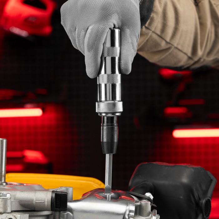 Ударно-поворотная отвертка Matrix 11575 с присоединительным шестигранником 1/2", с набором из 6 бит, в пластиковом боксе, используется для закручивания и откручивания крепежей, в том числе для демонтажа перетянутых или з...