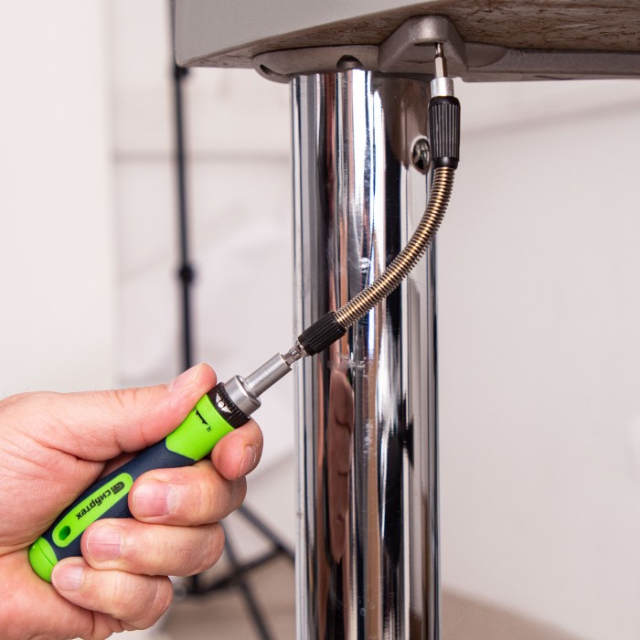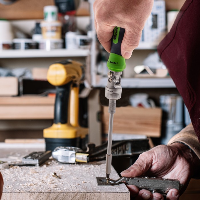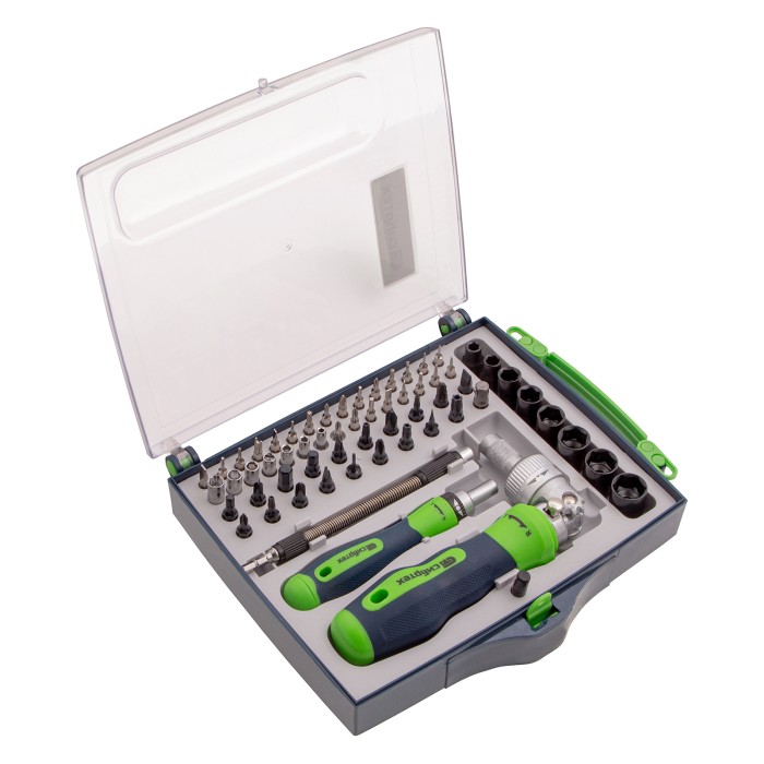 Отвертка реверсивная - 1 штОтвертка реверсивная для точных работ - 1 штГибкий удлинитель - 1 штТорцевые головки: 5, 6, 8, 9, 10, 11, 12, 13 мм - 8 штБиты: SL3, SL5, SL6, PH0, PH1, PH2, PZ2, T6, Т10, Т15, Т20, Т25, Т30, H4, H5, H6, SP4, TW 2,3 - 18 шт
