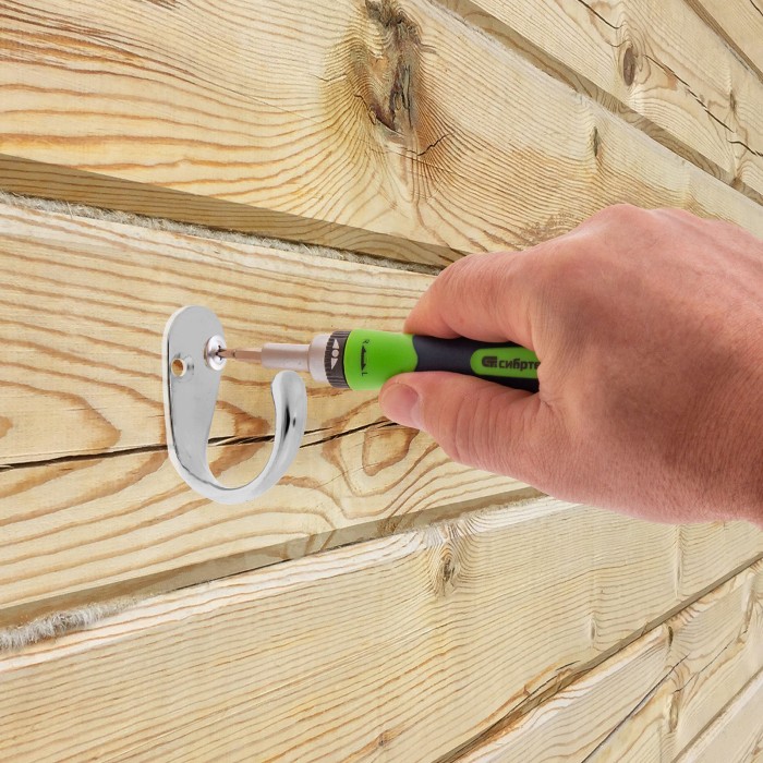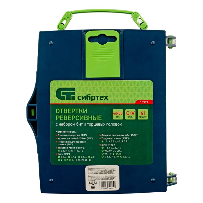 Реверсивные отвертки с набором бит и торцевых головок Сибртех 13363 — набор из 61 предмета из стали CrV, предназначенный для частных и профессиональных мастеров. Отвертка с поворотной головой позволяет осуществлять монтаж/демонтаж крепежа в труднодоступных местах, а отвертка для точных работ пригодится для ремонта техники и приборов с микровинтами.ПреимуществаВысокий ресурс — насадки из хромованадиевой стали рассчитаны на интенсивную эксплуатацию.Реверсивный механизм — отвертки можно вращать одной рукой, не перехватывая рукоятку.Комфортная работа — двухкомпонентные рукоятки не выскальзывают из ладони.Удобная транспортировка — набор поставляется в пластиковом кейсе с ручкой.
