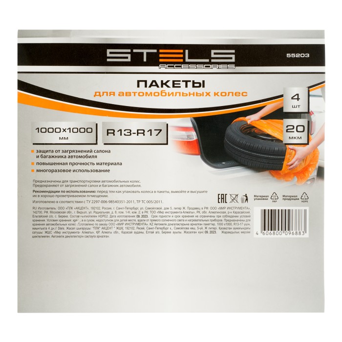 Пакеты Stels 55203 размером 1000 х 1000 мм, 4 шт. в комплекте, предназначены для бережного хранения и транспортировки автомобильных колес и шин R13-17. Исключают попадание в салон и багажник автомобиля пыли и грязи, предотвращают появление запаха резины в помещении.ПреимуществаУстойчивость к воздействию влаги и солнечного излучения — пакеты можно хранить на открытом балконе или в гараже на протяжении длительного времени.Возможность многоразового использования — материал толщиной 20 мкм отличается повышенной прочностью.Надежность — пакеты изготовлены в соответствии с ТУ 2297-006-98540351-2011 и требованиями ТР ТС 005/2011 «О безопасности упаковки».Набор из 4 штук — такого количества достаточно для упаковки полного комплекта шин.