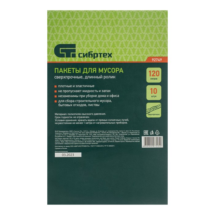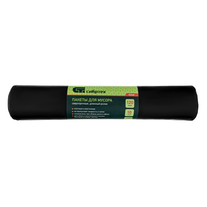 Сверхпрочные пакеты для мусора Сибртех 92749 из ПВД, объемом 120 л, 10 шт. в длинном ролике, имеют прямое дно и применяются для сбора мусора на даче, строительной площадке, во время уборки придомовой территории. Рассчитаны на транспортировку как легких бытовых, так и тяжелых строительных отходов, в том числе с острыми краями.ПреимуществаНадежность — износостойкие пакеты из полиэтилена высокого давления плотностью 60 мкм обладают высокой устойчивостью к разрыву.Удобная эксплуатация — специальная перфорация упрощает отделение пакетов от рулона.Универсальность — изделия устойчивы к воздействию химических веществ и агрессивных сред, поэтому подходят для утилизации практически любых отходов.Продуманная комплектация — 10 штук объемом 120 л хватит для сбора большого количества мусора.