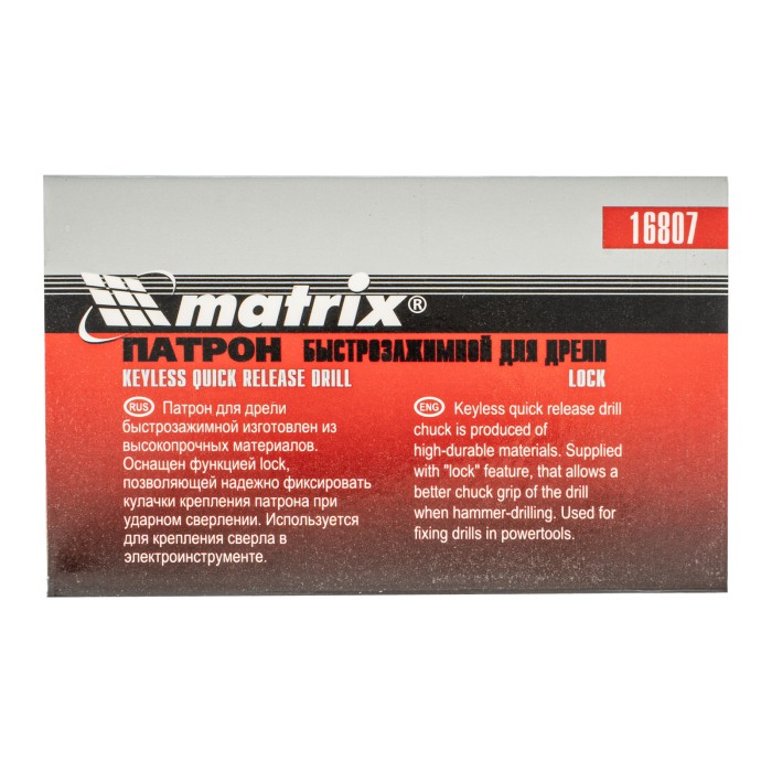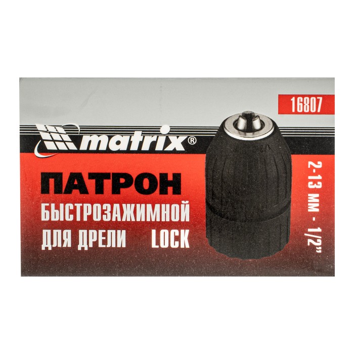 Быстрозажимной патрон для дрели Matrix 16807, тип соединения 1/2 дюйма, с опцией lock, используется для фиксации сверл диаметром 2-13 мм. Он обеспечивает надежную фиксацию оснастки без риска ее выпадения, подходит для ударного сверления. Пригодится начинающим мастерам и любителям для бытовых сверлильных работ.ПреимуществаТвердость кулачков патрона составляет 54-56 HRC, поэтому он выдерживает повышенные нагрузки.Благодаря функции lock патрон надежно фиксируется в дрели.Быстрозажимной патрон удобно использовать, т.к. он позволяет менять оснастку без использования дополнительных инструментов.Поверхность патрона имеет рифление, благодаря чему он не проскальзывает.Отчетливая маркировка упрощает поиск патрона в зоне хранения.