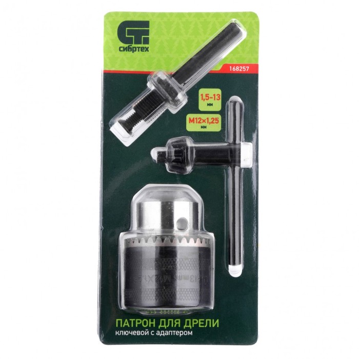Ключевой патрон Сибртех 168257, тип соединения М12х1,25, под оснастку 1,5-13 мм, с адаптером SDS PLUS, можно использовать как с дрелями, так и с перфораторами. Позволяет надежно зафиксировать сверло, работать без риска его прокручивания и выпадения. Пригодится в качестве основного или запасного патрона на строительной площадке.ПреимуществаСтойкость к нагрузкам — кулачки патрона закалены до твердости 54-56 HRC.Надежная фиксация оснастки — патрон оснащен ключевым механизмом.Рельефная поверхность — патрон не скользит в руках, за счет чего с ним удобно работать.Отчетливая маркировка — основные характеристики патрона нанесены на его корпус.Ключ в комплекте — его не придется покупать отдельно.