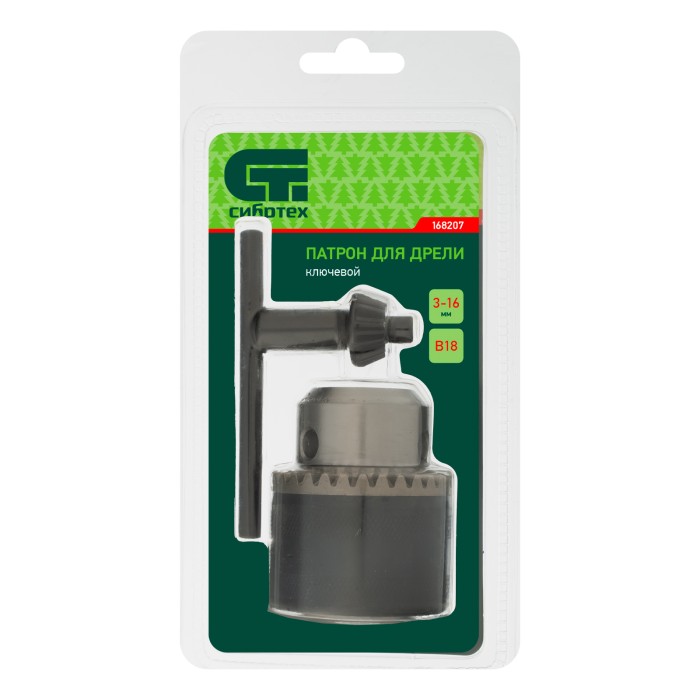 Ключевой патрон для дрели Сибртех 168207, тип соединения В18, обеспечивает надежную фиксацию сверл с хвостовиками 3-16 мм для осуществления сверлильных работ. Будет полезен в быту и для решения профессиональных задач.ПреимуществаТвердость кулачков патрона 54-56 HRC позволяет использовать его в ударном режиме и с повышенными механическими нагрузками.Оснастка в патроне фиксируется с помощью ключа, поэтому она надежно закреплена.Насечки на патроне предотвращают его проскальзывание в руках.Благодаря маркировке на корпусе патрона можно в любой момент посмотреть его характеристики.Патрон поставляется в комплекте с ключом и сразу готов к работе.