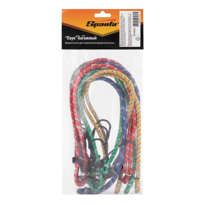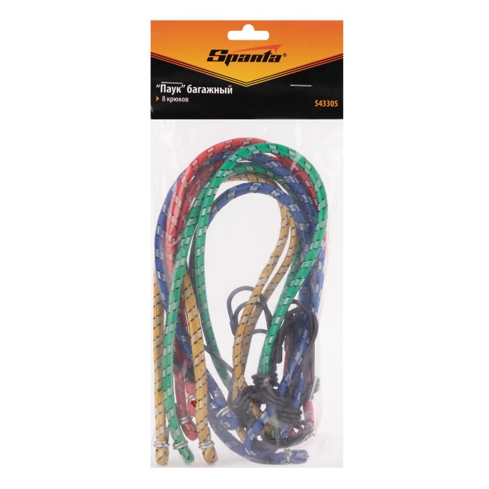 Резиновый багажный паук Sparta 543305 с 8 крюками используется для фиксации предметов на решетчатых конструкциях. Предотвращает смещение груза при перевозке в открытом багажнике на крыше легковой автомашины. Имеет оригинальную конфигурацию — 4 эластичных резиновых жгута длиной 45 см с крюками на концах перехвачены посередине кольцом. Благодаря такому строению паук надежно удерживает предметы сложной формы. Крепежное приспособление будет полезно в поездках на автомобиле.ПреимуществаБезопасная транспортировка груза — резиновые жгуты в синтетической оплетке выдерживают разрывную нагрузку до 45 кг.Надежность — крюки из углеродистой стали устойчивы к разгибанию при нагрузках.Защита багажника и кузова автомобиля от повреждений — на концах крюков имеются защитные колпачки.Яркие цвета — жгуты хорошо заметны на фоне багажа и среди других автомобильных аксессуаров.