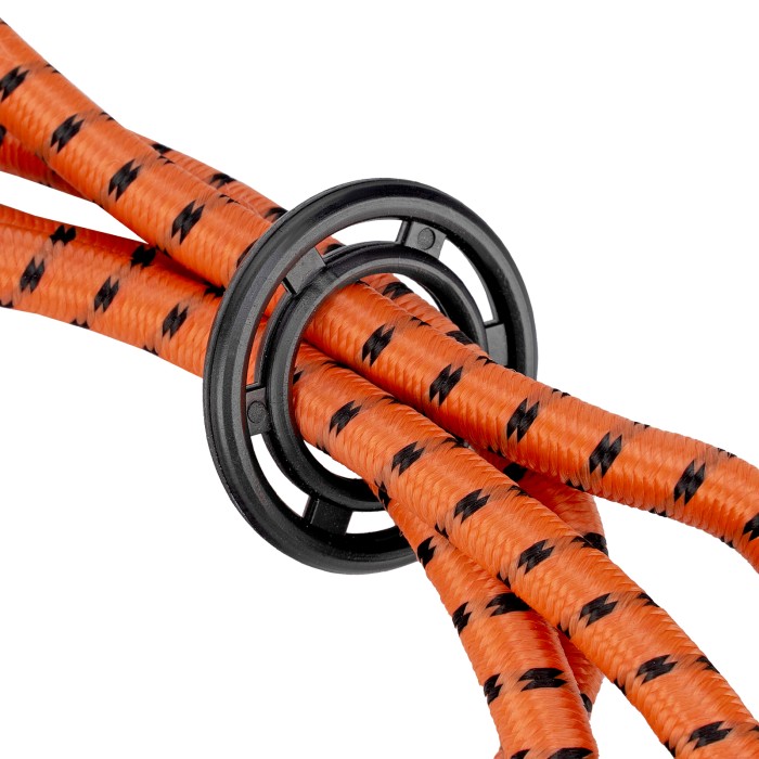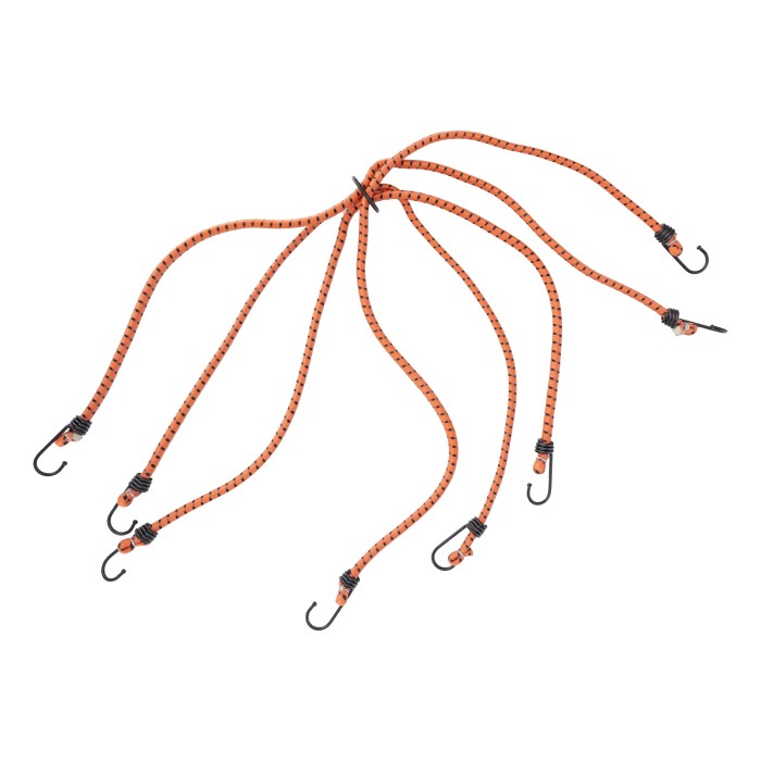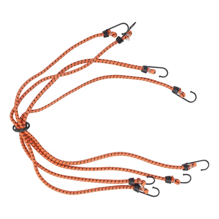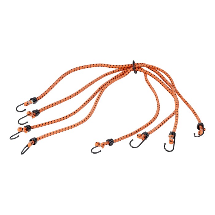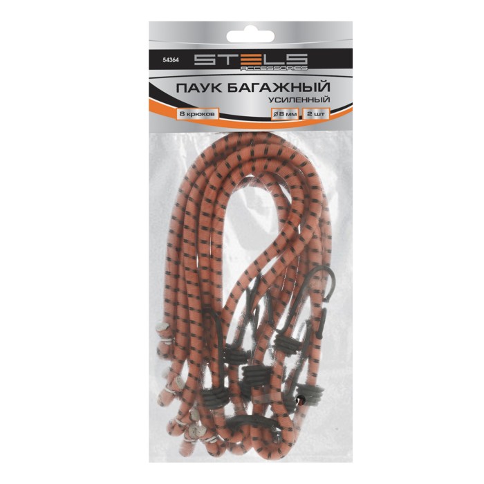 Усиленный багажный паук Stels 54364 с 8 крюками позволяет закрепить груз на решетке открытого багажника, устанавливаемого на крышу легкового автомобиля. 4 шнура длиной 80 см, схваченные кольцом посередине, надежно фиксируют предметы любой формы. Жгуты отличаются особой прочностью и эластичностью, поскольку на 50% состоят из латекса и на 50% — из резины. Изделие будет полезно при транспортировке грузов на дачу или во время путешествия.ПреимуществаБезопасная транспортировка груза — жгуты в синтетической оплетке выдерживают разрывную нагрузку до 45 кг.Надежность — крюки из углеродистой стали устойчивы к разгибанию при нагрузках.Защита багажника и кузова автомобиля от повреждений — на концах крюков имеются защитные колпачки.Яркий цвет — оранжевые жгуты хорошо заметны на фоне багажа и среди других автомобильных аксессуаров.