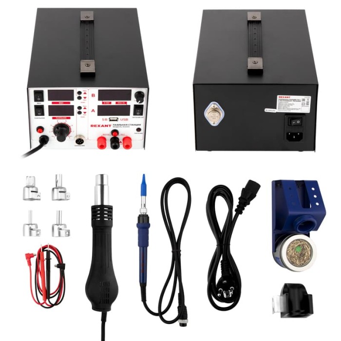 Уникальная многофункциональная паяльная станция 3 в 1 применяется для демонтажа или пайки различных видов электронных компонентов. Используется для ремонта портативной электроники, бытовой техники, а также для сборочных операций в небольшом производстве.Паяльная станция оснащена термофеном, паяльником и источником питания. Все три функции автономны и могут работать независимо друг от друга. USB разъем обеспечивает соединение станции с другим оборудованием.Конструктивные преимущества: микрокомпьютер для цифрового отображения данных и контроля температуры с точностью до 1 °C, большая мощность, быстрый разогрев. В комплектацию станции входят: основной блок, сетевой шнур, термофен, паяльник, держатель паяльника, держатель термофена, губка для очистки жала паяльника (в ложементе), 4 насадки для термофена 5, 8, 10 и 13 мм, а также 1 пара проводов для БП.