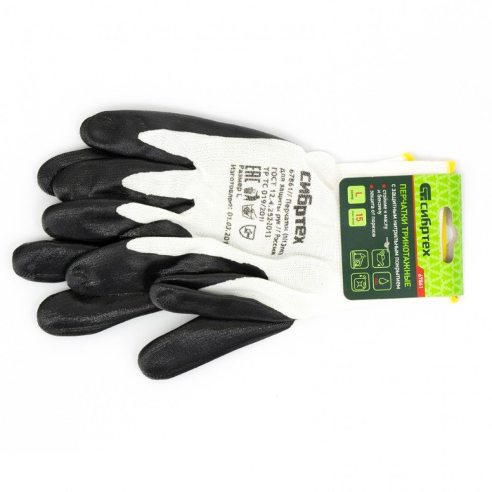 Маслобензостойкие полиэфирные перчатки Сибртех 67861 с черным нитрильным покрытием, 15 класса вязки, размера L, предназначены для выполнения хозяйственных, ремонтных, строительных и автослесарных работ, в том числе предполагающих контакт с агрессивными веществами. Покрытие из нитрила защищает кожу рук от попадания бензина, масла или краски, а также от влаги и загрязнений. Плотная пряжа предохраняет ладони от царапин, ссадин, порезов и мозолей. Перчатки будут полезны дома, в гараже или на даче.ПреимуществаДолговечность — перчатки изготовлены из полиэфирной пряжи, обладающей высокой прочностью на разрыв и устойчивостью к истиранию.Эффективное выполнение точных работ — тонкое полотно обеспечивает тактильную чувствительность пальцев.Надежный хват — нитрильное покрытие не скользит по поверхности инструмента.Плотная посадка — эластичные манжеты надежно фиксируются на запястьях, поэтому перчатки не сползают с кистей рук.Гипоаллергенность — материал перчаток безопасен для здоровья.Комфортная работа — трикотажная ткань приятна на ощупь и обеспечивает хороший воздухообмен, благодаря чему кожа рук дышит и не потеет.