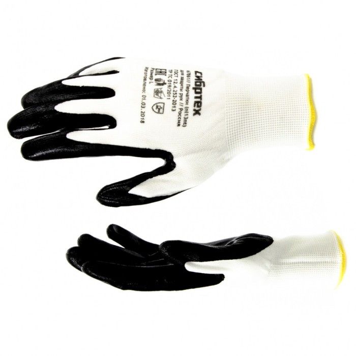 Маслобензостойкие полиэфирные перчатки Сибртех 67861 с черным нитрильным покрытием, 15 класса вязки, размера L, предназначены для выполнения хозяйственных, ремонтных, строительных и автослесарных работ, в том числе предп...