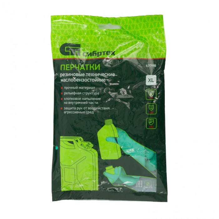 Маслобензостойкие резиновые технические перчатки Сибртех 67798 размера XL надежно защищает руки от воздействия агрессивных сред: топлива, масла, чистящих средств, слабых химических веществ. Пригодятся дома, в саду, гараже при работе с удобрениями, химикатами и нефтяными продуктами.ПреимуществаДолговечность — перчатки из латекса отличаются прочностью и маслобензостойкостью.Надежный хват — благодаря рельефной поверхности пальцевой и ладонной части перчаток инструменты и детали не выскальзывают из рук.Гипоаллергенность — на внутренней поверхности перчаток имеется хлопковое напыление.Комфортная работа — перчатки легко надеваются, тактильная чувствительность в них сохраняется.