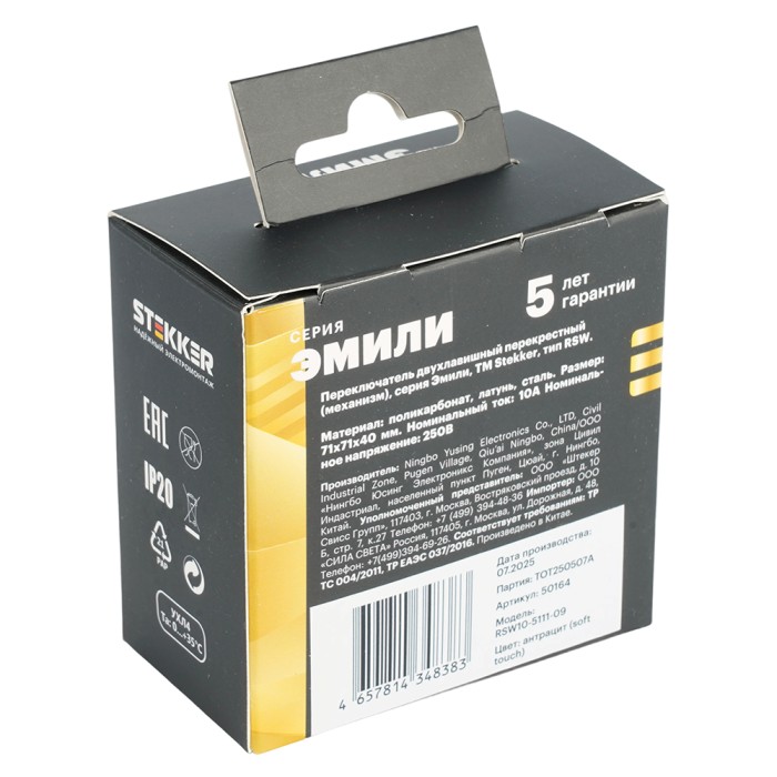 Переключатель перекрестный 2-клавишный (механизм), STEKKER, 250В, 10А, серия Эмили, RSW10-5111-09, антрацит, soft touch 50164