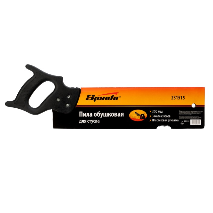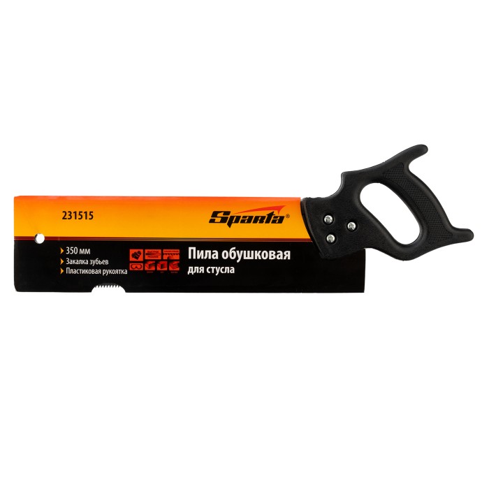 Обушковая пила для стусла Sparta 231515 с полотном длиной 350 мм используется для распиливания под углом заготовок из древесины, фанеры или ДСП. Пилить можно вдоль или поперек волокон. В верхней части полотна имеется ребро жесткости, которое не дает ему сгибаться. Шаг зубьев составляет 7-8 TPI, что обеспечивает быстрый рез. Допускается переточка режущей кромки. Инструмент применяется во время выполнения столярных работ.ПреимуществаПрочность и упругость — полотно изготовлено из холоднокатаной пружинной стали 65Mn.Высокий показатель износостойкости — зубья закалены до твердости 45 HRC.Решение широкого спектра задач — зубья с двухгранной заточкой позволяют проводить распиловку в направлении как на себя, так и от себя.Защита от разрушения — поверхность полотна покрыта лаком для предотвращения коррозии.Надежная конструкция — полотно надежно зафиксировано 3 винтами и не выскочит из рукоятки во время работы.Эргономичность — пластиковая рукоятка с рельефной поверхностью не выскальзывает из ладони.