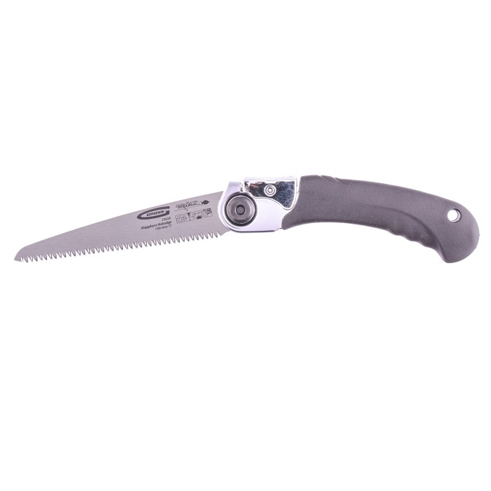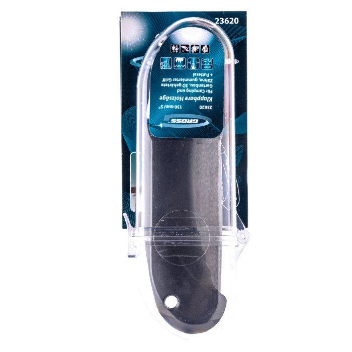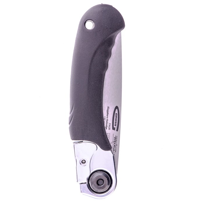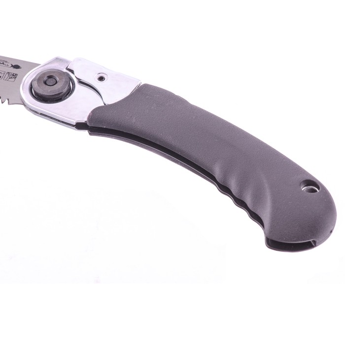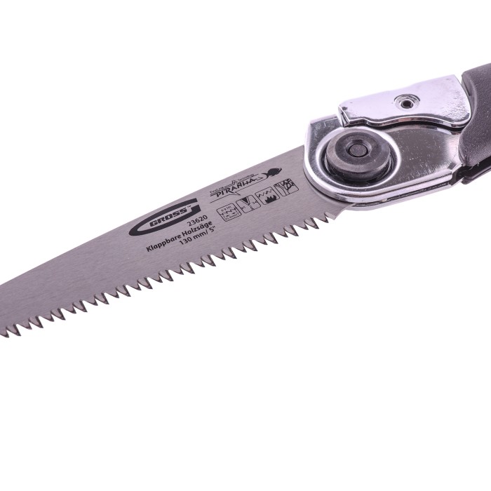 Складная пила по дереву Gross PIRANHA 23620 с полотном длиной 130 мм, калеными зубьями с 3D-заточкой и шагом 8-9 TPI, с обрезиненной рукояткой, в кобуре, предназначена для кемпинга и работы в саду. Подходит для продольного и поперечного пиления древесины. Зубья с трехгранной заточкой и шагом 8-9 TPI обеспечивают быструю распиловку. Пила легко складывается, поэтому ее можно брать с собой в поездку, поход или на пикник, не опасаясь пораниться в процессе транспортировки. В комплект входит чехол-кобура, которую можно повесить на ремень.ПреимуществаПрочность — полотно изготовлено из высококачественной японской стали SK-5 твердостью 52 HRC.Высокий ресурс — зубья закалены на 2/3 высоты до твердости 64-66 HRC, а их менее закаленные основания устойчивы к слому при обработке древесины твердых пород.Комфортная и безопасная работа — эргономичная обрезиненная рукоятка не выскальзывает из ладони.Удобное хранение и транспортировка — в рукоятке предусмотрено отверстие для подвешивания пилы.Гарантированное качество — пила изготовлена в Тайване на высокотехнологичном оборудовании.