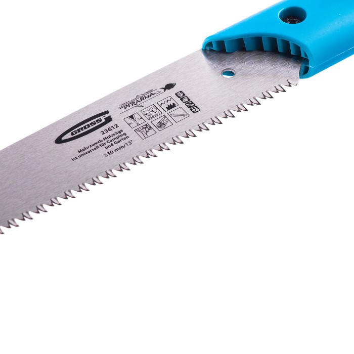 Универсальная пила по дереву Gross PIRANHA 23612 с полотном длиной 330 мм, калеными зубьями с шагом 9-10 TPI и 3D-заточкой, с 2-компонентной рукояткой, используется во время работ в саду и кемпинге. С ее помощью можно обрезать сучья или заготовить материал для растопки. Также пила подходит для распиловки фанеры, ДВП, ПВХ. Выполняет продольный и поперечный распил. Зубья с шагом 9-10 TPI и трехгранной заточкой обеспечивают высокую производительность инструмента. Благодаря высококачественной заточке зубьев характеристики режущей кромки соответствуют всем международным стандартам.ПреимуществаДолговечность — полотно изготовлено из высококачественной японской стали SK-5 твердостью 48-52 HRC.Износостойкость — закаленные до твердости 64-66 HRC зубья долго сохраняют остроту.Прочность — менее закаленные основания зубьев обеспечивают их устойчивость к слому при распиловке древесины твердых пород.Коррозионная стойкость — на полотно нанесено защитное лаковое покрытие.Комфортная работа — эргономичная двухкомпонентная рукоятка с нескользящей поверхностью удобно ложится в руку.Безопасность — защитный пластиковый пенал исключает риск получения травмы во время хранения или транспортировки пилы.Удобное хранение — в рукоятке имеется отверстие для подвешивания на скобу или крючок.Гарантированное качество — пила изготовлена в Тайване на высокотехнологичном оборудовании.