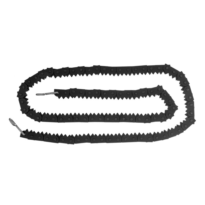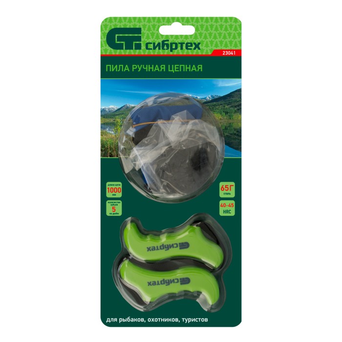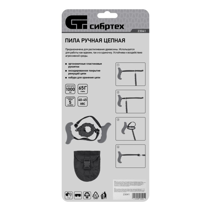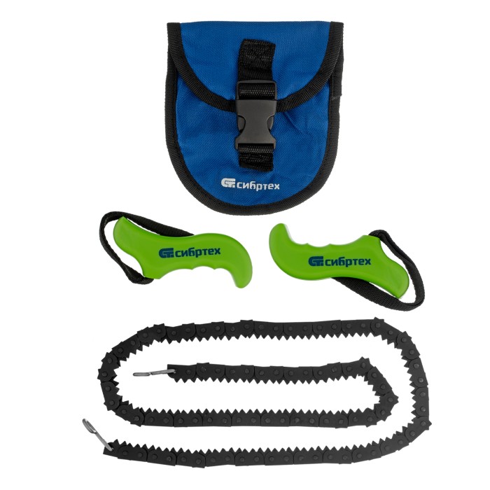 Пила ручная цепная Сибртех 23041 длиной 1000 м, с чехлом-кобурой, предназначена для поперечного распиливания древесины. Шаг зубьев составляет 5 TPI, что обеспечивает высокую скорость работы. Рукоятки надежно прикреплены к крюкам ремешками из полиэстера. Инструмент пригодится на дачном участке, в поездке, походе или на рыбалке, может использоваться для заготовки дров.ПреимуществаПрочность и упругость — пила из рессорно-пружинной стали устойчива к динамическим нагрузкам.Высокий ресурс — зубья закалены до необходимой твердости, поверхность пилы оксидирована для защиты от коррозии.Надежная конструкция — для натягивания полотна предусмотрены прочные стальные крюки.Комфортная и безопасная работа — пластиковые рукоятки с подпальцевыми выемками удобно лежат в руках и не выскальзывают из ладоней.Удобное хранение и транспортировка — сложенная пила убирается в компактный чехол-кобуру, который можно повесить на пояс.